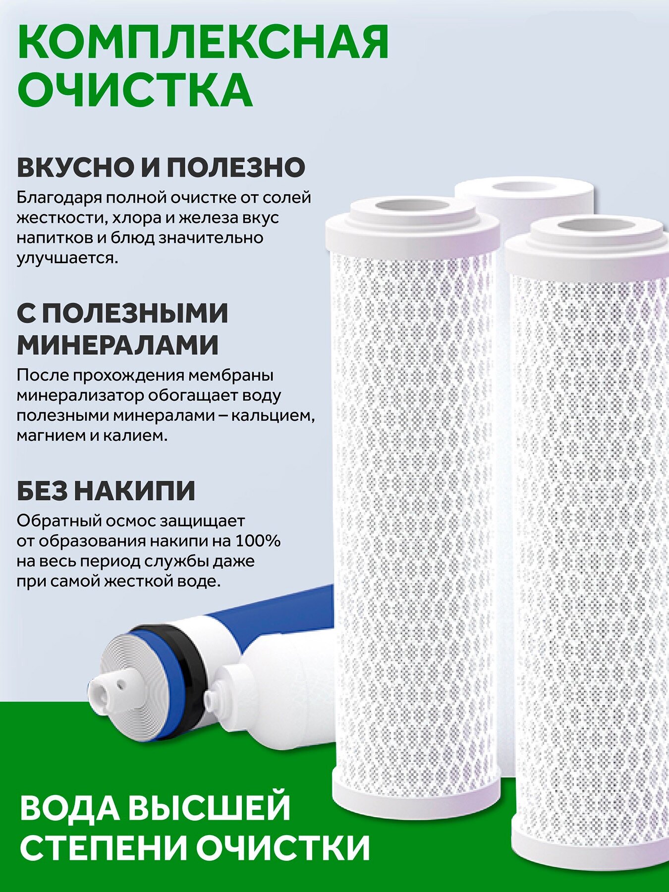 | ВКоробке | Картридж PP 5 - 10SL - 1 шт. Картридж CBC 10 - 10SL - 2 шт. Обратноосмотическая мембрана - 1 шт. Угольный постфильтр - 1 шт. Минерализатор B (RO) - 1 шт. Инструкция - 1 шт. |