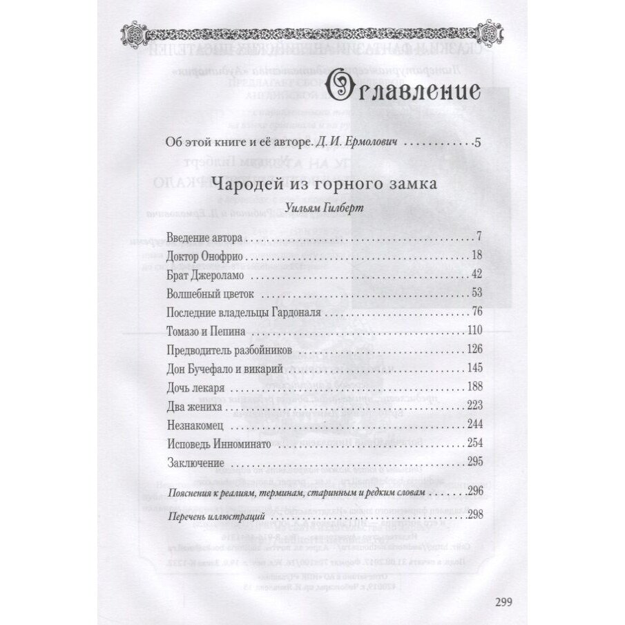 Уильям Гилберт-старший,бывший когда-то весьма плодовитым писателем, ныне известен лишь как отец Уильяма - младшего, драматурга -либреттиста из популярного дуэта Гилберт и Салливан. А между тем, его творчество, впервые представленное на русском языке,оказалось весьма любопытным. Конечно, это не сказки в прямом смысле этого слова и уж тем более не сказки для детей. Больше всего истории из этого сборника напомнили мне мистические новеллы Брэма Стокера и Шеридана Ле Фаню, а еще готические рассказы Диккенса и Эдгара По. Зачин сборника традиционный: в руки автора, путешествующего по прекрасной Италии, попадает рукопись некоего приходского священника. Рукопись состоит из различных историй,объединенных общих персонажем - загадочным чародеем и алхимиком Инноминато. В трудных ситуациях люди,несмотря на страх перед ним, обращаются к нему за помощью - и он помогает... на свой лад. Истории самые разные по содержанию - трагические,комические, любовные и со смыслом. Во многих присутствуют сказочные мотивы, что, видимо, и дало повод окрестить их сказками.