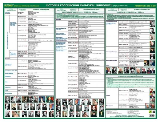 Представляет собой лист плотной глянцевой бумаги формата А3. С двух сторон написаны по периодам: стиль - выдающиеся художники - названия их основных произведений. Картин нет, но есть портреты художников. Т.е. в этом пособии даны основы, но остальное надо искать самим. не уверена, что представлены именно те художники, произведения которых спрашиваются на ЕГЭ, к тому же их слишком много.