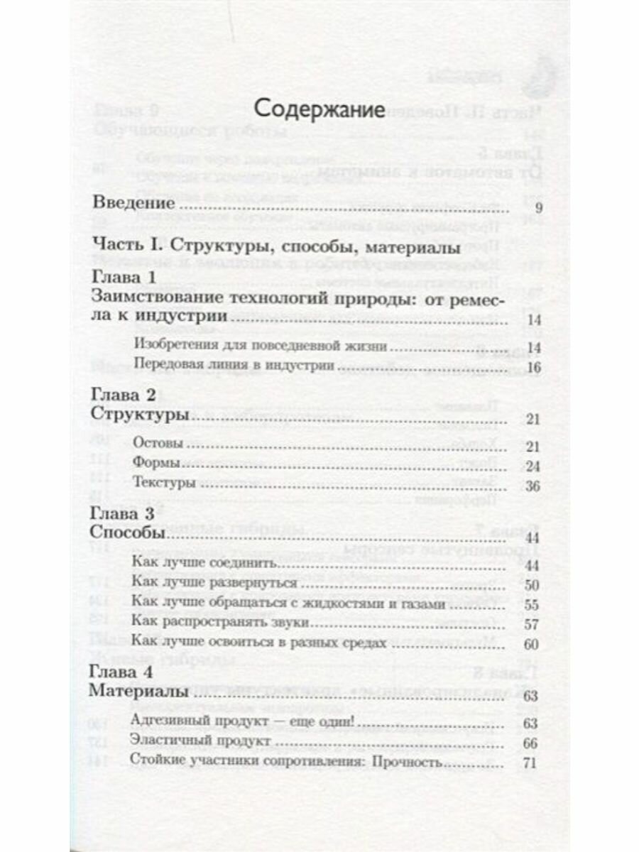 Авторы рассматривают множество примеров и знакомят читателя с разными областями бионики, ее практическими и фундаментальными разработками. Например, вы найдете здесь рассказы о текстурах с необыкновенными сцепляющими (адгезивными) свойствами, которые к тому же способны "переклеиваться" бесчисленное число раз, как лапы ящерицы геккона. Вы познакомитесь с приспособлениями, возникающими в определенных экосистемах; с адаптивными роботами, которые обучаются на собственном опыте методом проб и ошибок или даже эволюционируют сами по себе поколение за поколением. А еще узнаете о разработках гибридных систем, где плесень … управляет шестиногим роботом. Наконец, о нейропротезах, которые переводят мысль в соответствующее движение…
