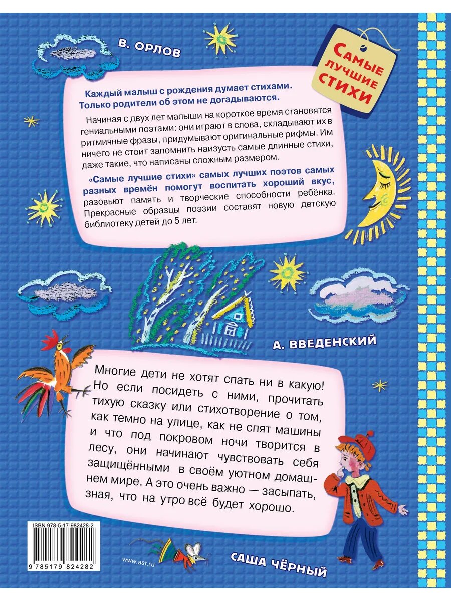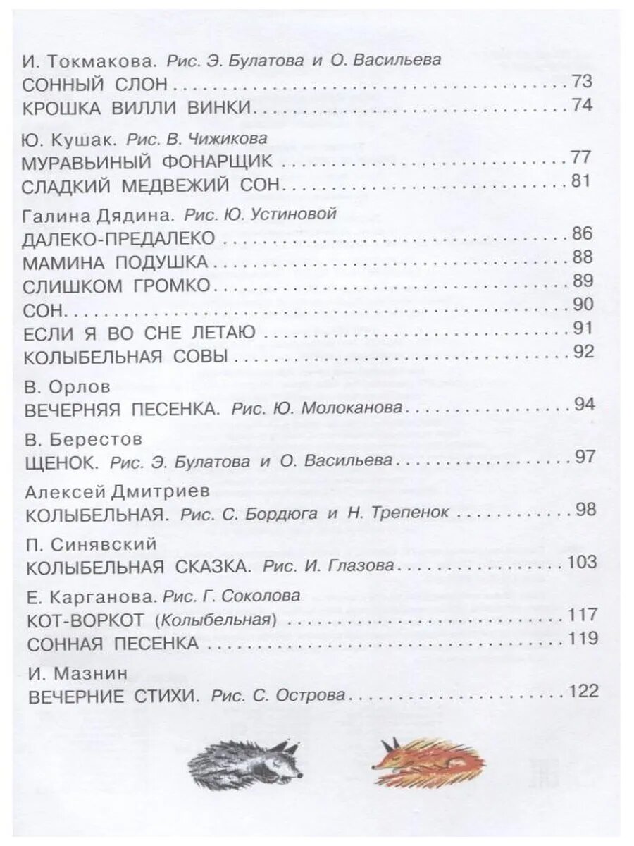 Хорошая книга, подходит для детей разных возрастов и разной скорости засыпания - есть короткие, и длинные стишки )) Начала читать ее дочери с младенчества и она до сих пор (2,5) иногда просит почитать из нее. Месяцев с 8 она начала сама ее листать - конечно же получалось неловко, поэтому книга уже клееная-переклеенная, но от этого не менее любимая ))
