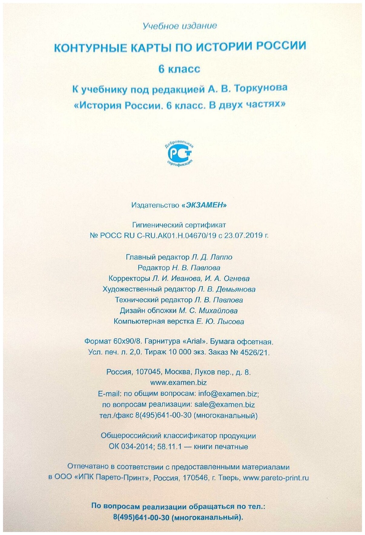 Контурные карты по истории России. 6 класс. К учебнику под редакцией А. В. Торкунова "История России. 6 класс" (Лаппо Л., (ред.)); Экзамен Издательство, 2019