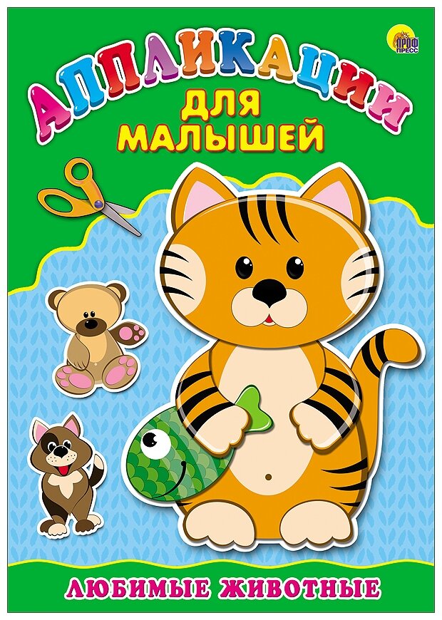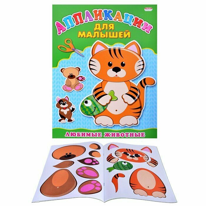 Отличные аппликации для маленьких детей. Иллюстрации яркие, чёткие, бумага плотная. Внутри книги изображены животные, которые должны получиться у малыша после вырезания деталей и склеивания их. Животные - заяц, медведь,собака и кот. К сожалению в самой книге нет места для наклеивания деталей, пришлось клеить их на альбомный лист.