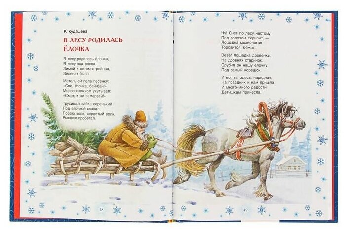 Приобрели книгу в начале зимы ребенку двух с половиной лет для создания предпраздничной атмосферы и знакомства с зимой. Вначале несколько смутило слишком уж разнородное сочетание стихотворений, рассчитанных на разный возраст (от Пушкина "Вот север, тучи нагоняя..." до Усачева "Дед Мороз пришел в нам в сад, /Дед Мороз позвал ребят..."). Однако с удовольствием читаем уже третий месяц почти ежедневно. Есть, конечно, излюбленные стихи, но ребенку и этого возраста интересно слушать всю книгу.