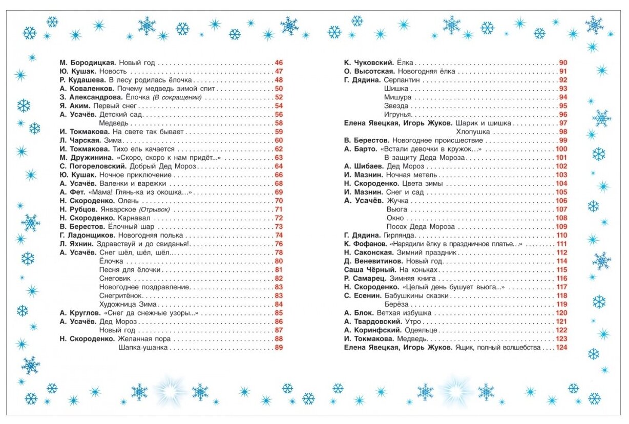 В сборник вошли произведения как классиков детской поэзии, так и современных авторов. Это и "Зима" И. Сурикова, "Чародейкою-Зимою…" Ф. Тютчева, "Мороз-воевода Н. Некрасова, "Ветхая избушка" А. Блока, "Встали девочки в кружок…" А. Барто, "Снеговик" А. Усачева, "Серпантин" Г. Дядиной и многие другие.