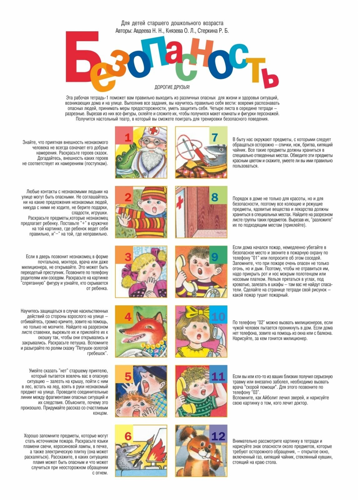 Рабочая тетрадь предназначена для занятий с детьми старшего дошкольного возраста не только в детском саду, но и в домашних условиях, на даче. Выполняя задания, дети учатся правильно себя вести - вовремя распознавать опасных людей и дома, и на улице, уметь защитить себя во время пожара, избегать опасных ситуациях, находясь без присмотра взрослых.