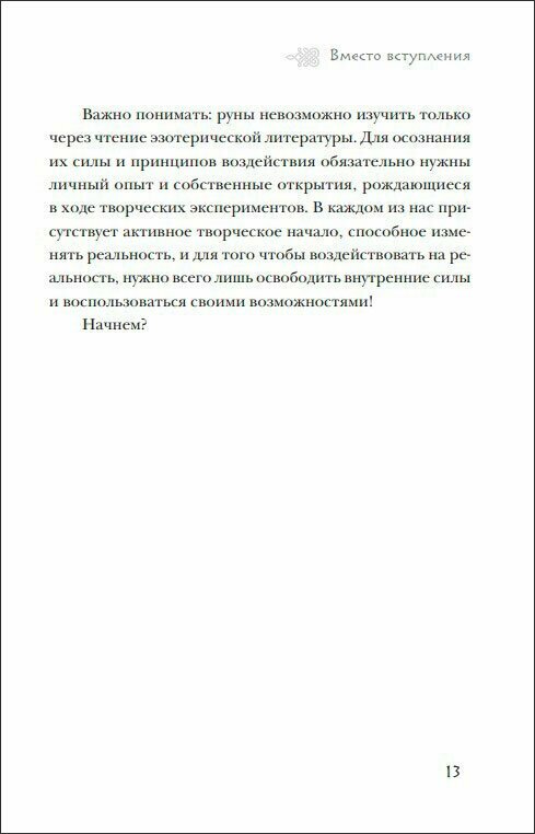 В книге последовательно и понятно изложена суть такого тонкого и отзывчивого инструмента как руны. Описано значение каждой руны, куда, как, чем и для чего наносить их - это очень важно при обучении, особенно на начальном этапе. Рекомендую книгу для прочтения и получения навыков работы с рунами.