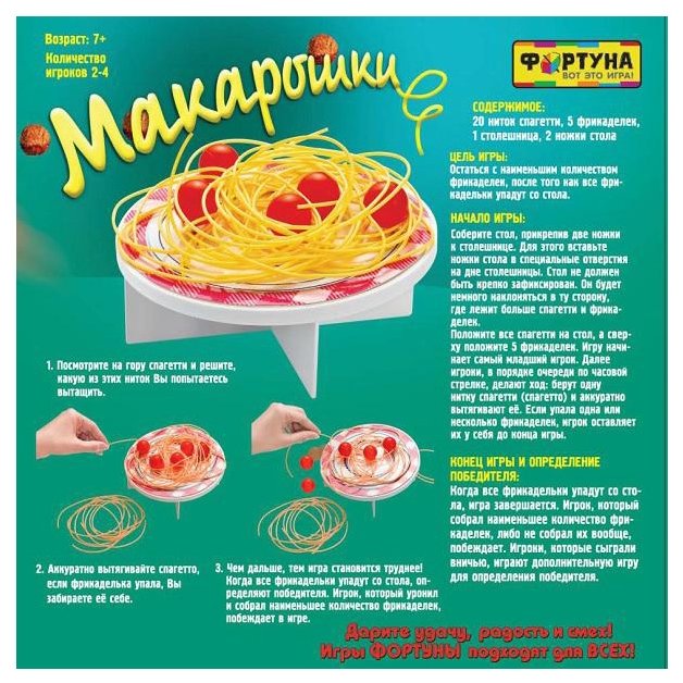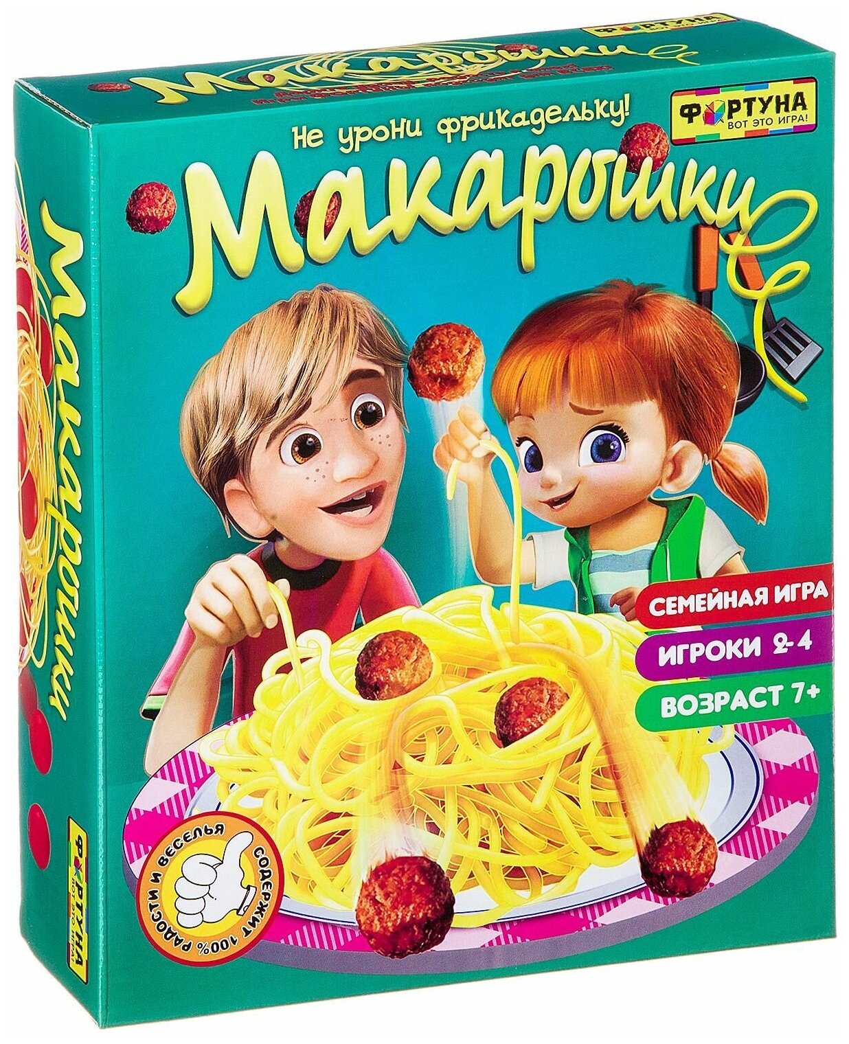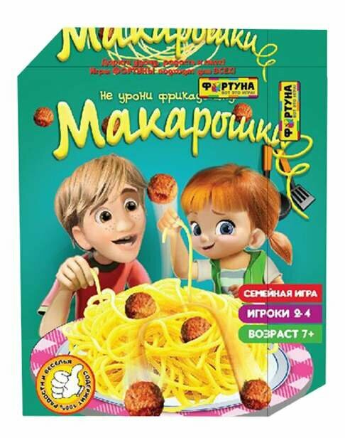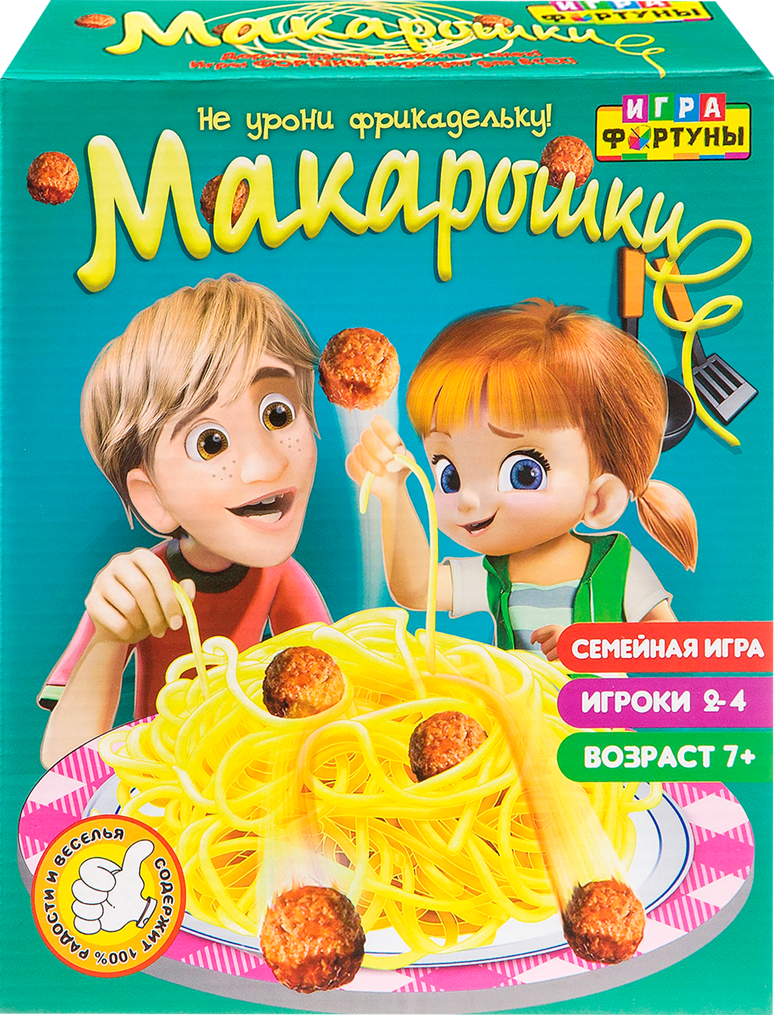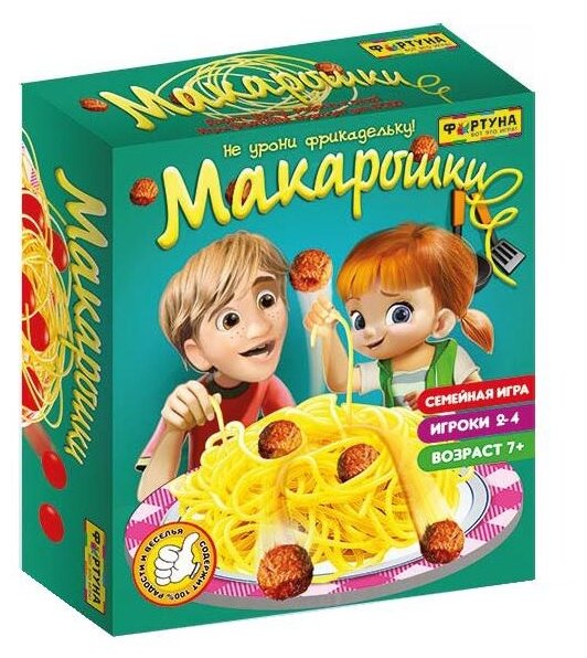 Настольная семейная игра "Макарошки" от компании "Фортуна" - это гарантия увлекательного и веселого досуга в кругу самых близких людей. Игрокам предстоит проявить воображение и окунуться в атмосферу самого настоящего семейного ужина, коронным блюдом которого являются макароны с фрикадельками. В ходе игры участникам необходимо проявить ловкость и постараться не выронить ни одну фрикадельку.