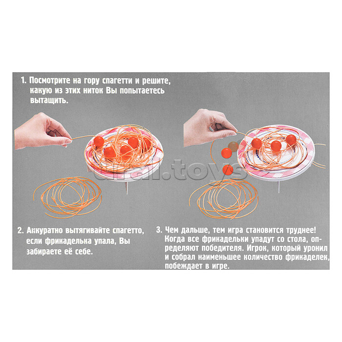 Макарошки - увлекательная семейная игра. Действие игры происходит за воображаемым семейным ужином. Игрокам необходимо справиться с макаронами, не уронив при этом спрятавшиеся в них фрикадельки. Игра развивает ловкость, скорость реакции и координацию движений. Хорошее настроение и детский смех гарантированы! Состав игры: 20 ниток спагетти, 5 фрикаделек, столешница, 2 ножки стола.