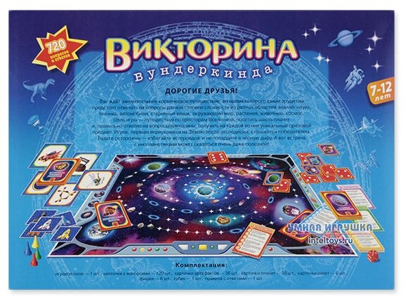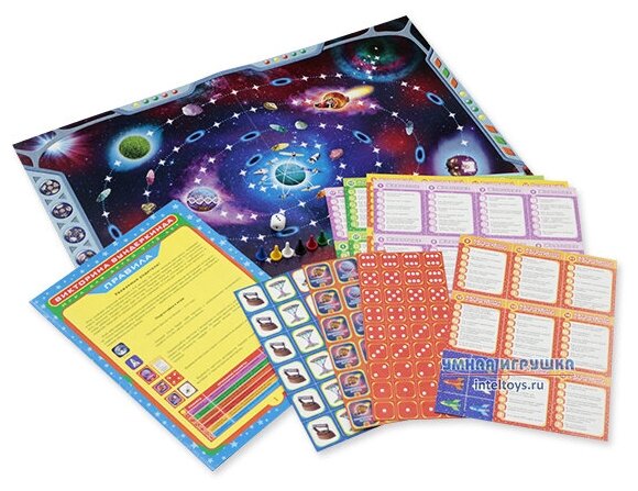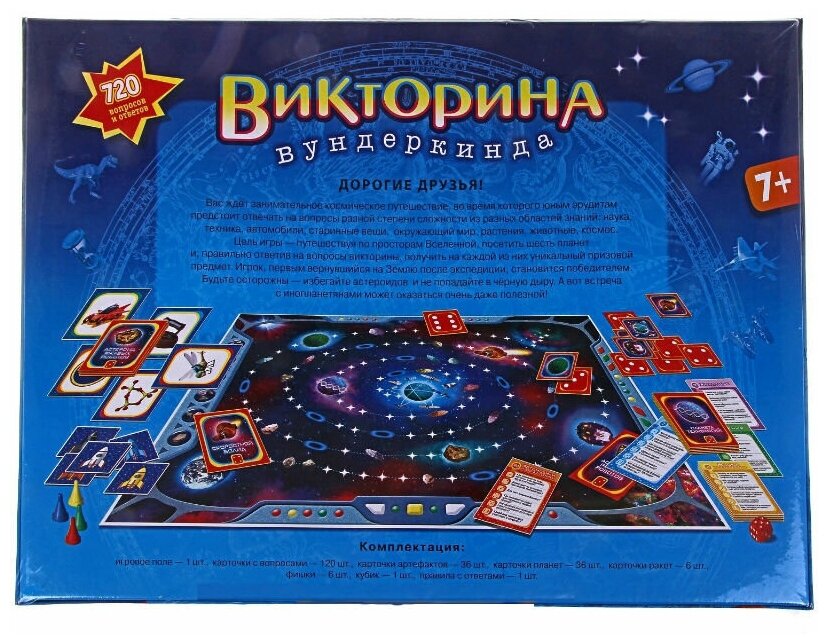 | Состав набора | игровое поле (1 шт.), правила с ответами (1 шт.), кубик (1 шт.), карточки с вопросами (120 шт.), фишки (6 шт.), карточки артефактов (36 шт.), карточки ракет (6 шт.), карточки планет (36 шт.) |