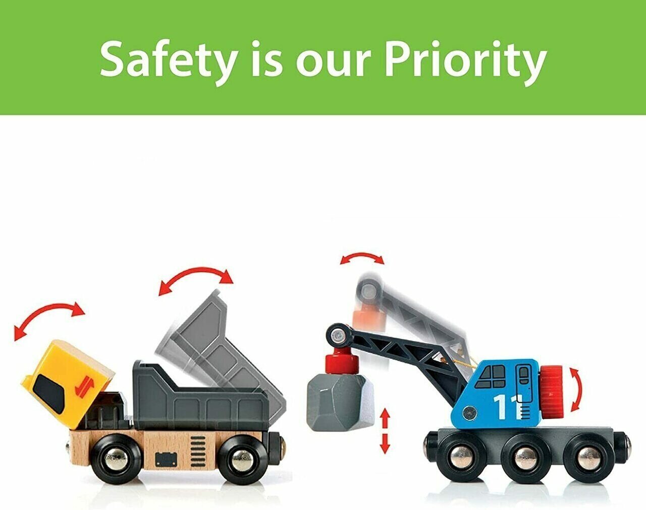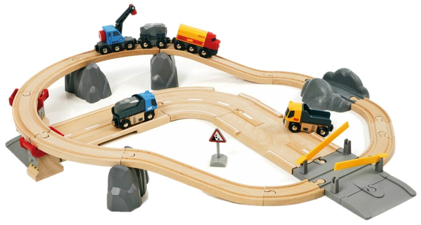| Состав набора | входит железнодорожное полотно, грузовой состав, состоящий из локомотива, грузового вагона и вагона-крана, два грузовых автомобиля, полотно железной дороги и автомобильной дороги, переезд и специальные стойки для подъёма рельс деревянной железной дороги на второй уровень, автомобильный знак |