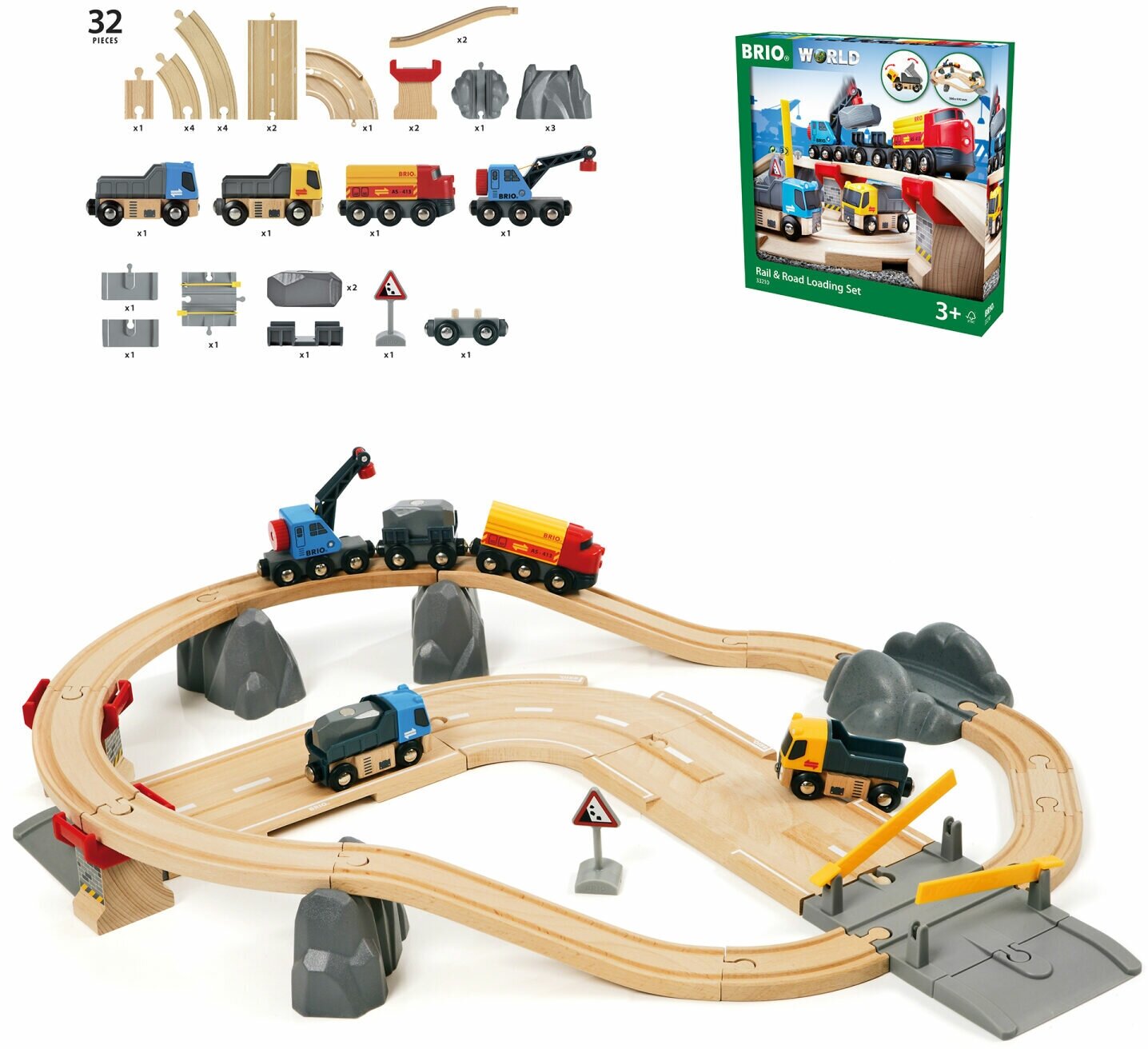 Набор железной дороги Brio привлечет внимание не только мальчиков, но и девочек. В комплект входит железнодорожное полотно, грузовой состав, состоящий из локомотива, грузового вагона и вагона-крана, два грузовых автомобиля, переезд и специальные стойки для подъёма рельс на второй уровень. С помощью крана можно перенести груз из автомобилей в грузовой вагон и обратно. Машинки могут съезжать на пол по специальным съездам.