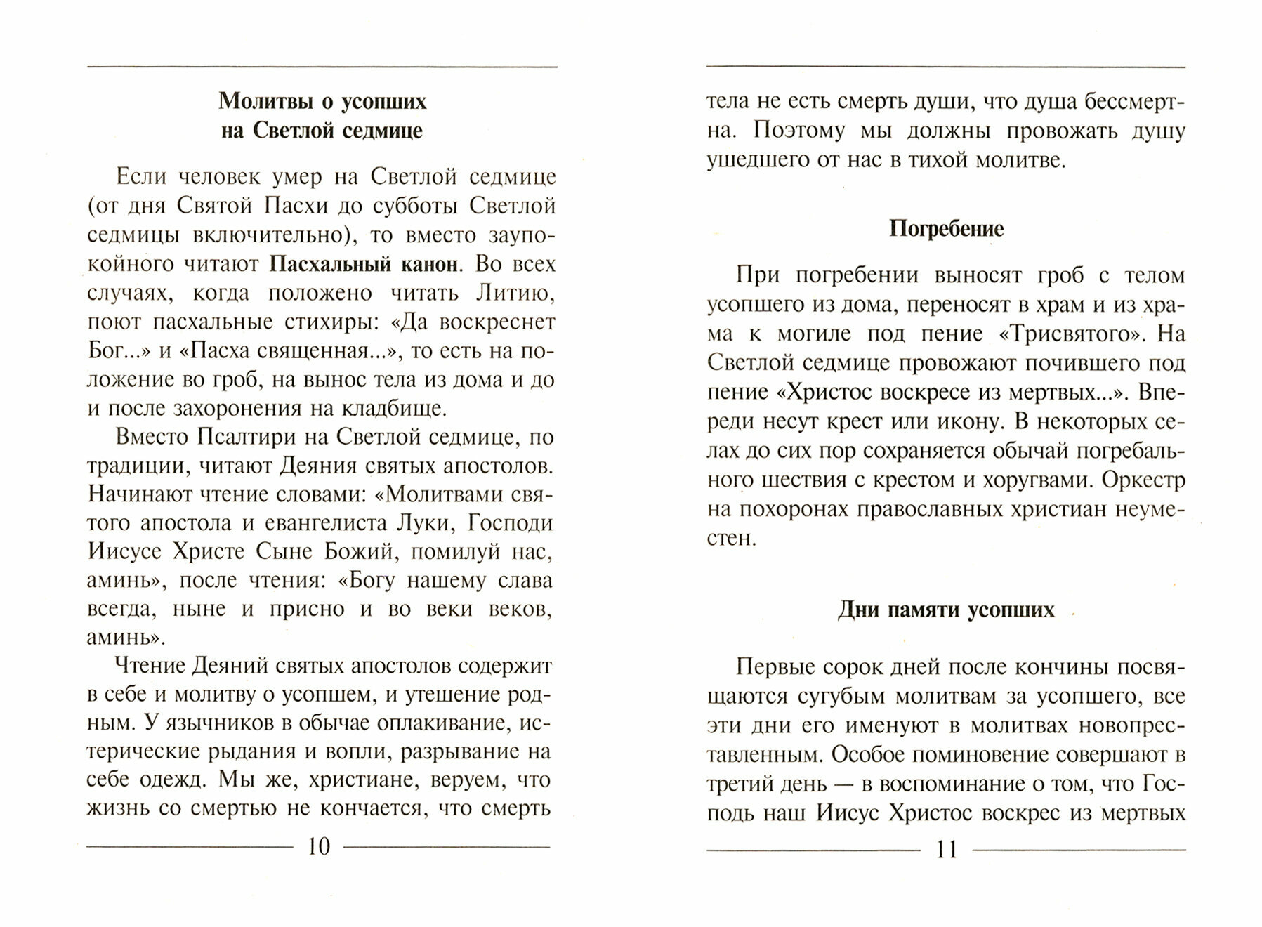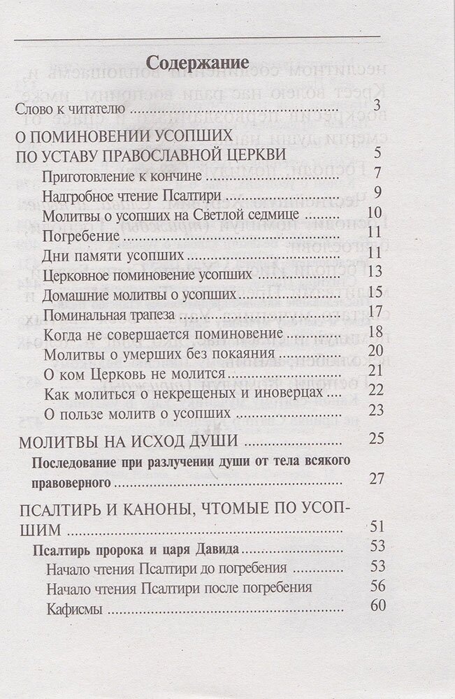 В книге собраны все необходимые молитвословия для поминовения усопших по уставу Русской Православной Церкви: последование при разлучении души от тела, каноны о усопших, в том числе читаемый на Вселенскую родительскую субботу, панихида, лития, Псалтирь, причем Псалтирь дается с указаниями, как полагается ее читать до погребения и после. Публикуются также каноны о усопших без покаяния и не принявших Святое Крещение. Тексты приведены только канонические, содержащиеся в православных богослужебных книгах Октоихе, Триоди, Следованной Псалтири. При составлении использованы труды святителя Афанасия (Сахарова).