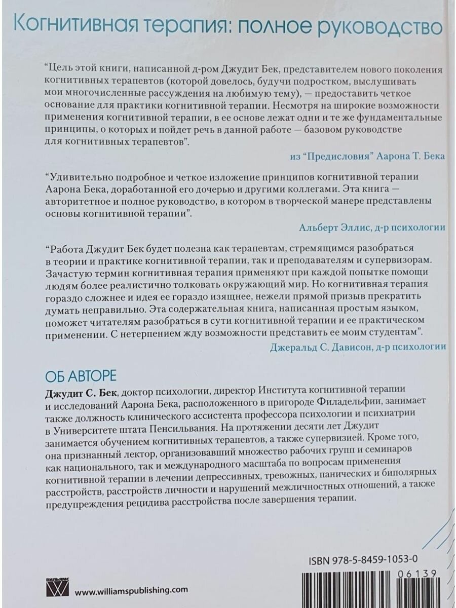 книгу только получила, но сразу скажу - за такую цену и ориентируясь на название "полное руководство" ожидала большего. качество печати хорошее, но сама книга небольшая. много примеров, но, по сути ,просмотрев содержание приходишь к выводу, что в работах Бека и Эллиса все это уже написано . для новичка в КПТ, возможно, будет много полезного...психотерапевтам со стажем книга вряд ли окажется столь же полезной