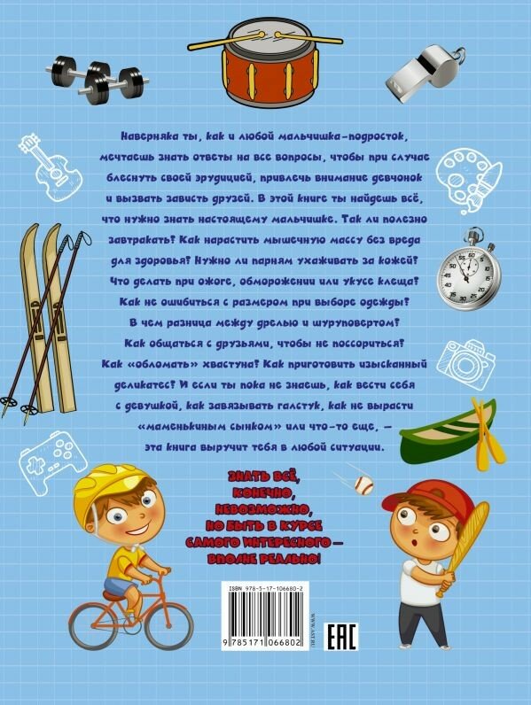 Наверняка ты, как и любой мальчишка-подросток, мечтаешь знать ответы на все вопросы, чтобы при случае блеснуть своей эрудицией, привлечь внимание девчонок и вызвать зависть друзей. В этой книге ты найдешь всё, что нужно знать настоящему мальчишке. Так ли полезно завтракать? Как нарастить мышечную массу без вреда для здоровья? Нужно ли парням ухаживать за кожей? Что делать при ожоге, обморожении или укусе клеща? Как не ошибиться с размером при выборе одежды? В чем разница между дрелью и шуруповертом? Как общаться с друзьями, чтобы не поссориться? Как «обломать» хвастуна? Как приготовить изысканный деликатес? И если ты пока не знаешь, как вести себя с девушкой, как завязывать галстук, как не вырасти «маменькиным сынком» или что-то еще, – эта книга выручит тебя в любой ситуации. Знать всё, конечно, невозможно, но быть в курсе самого интересного – вполне реально!