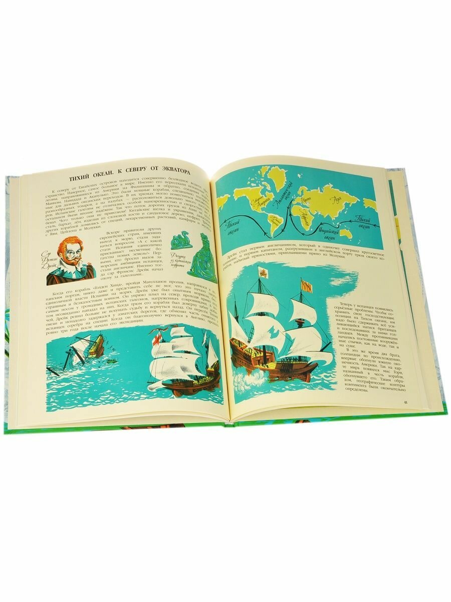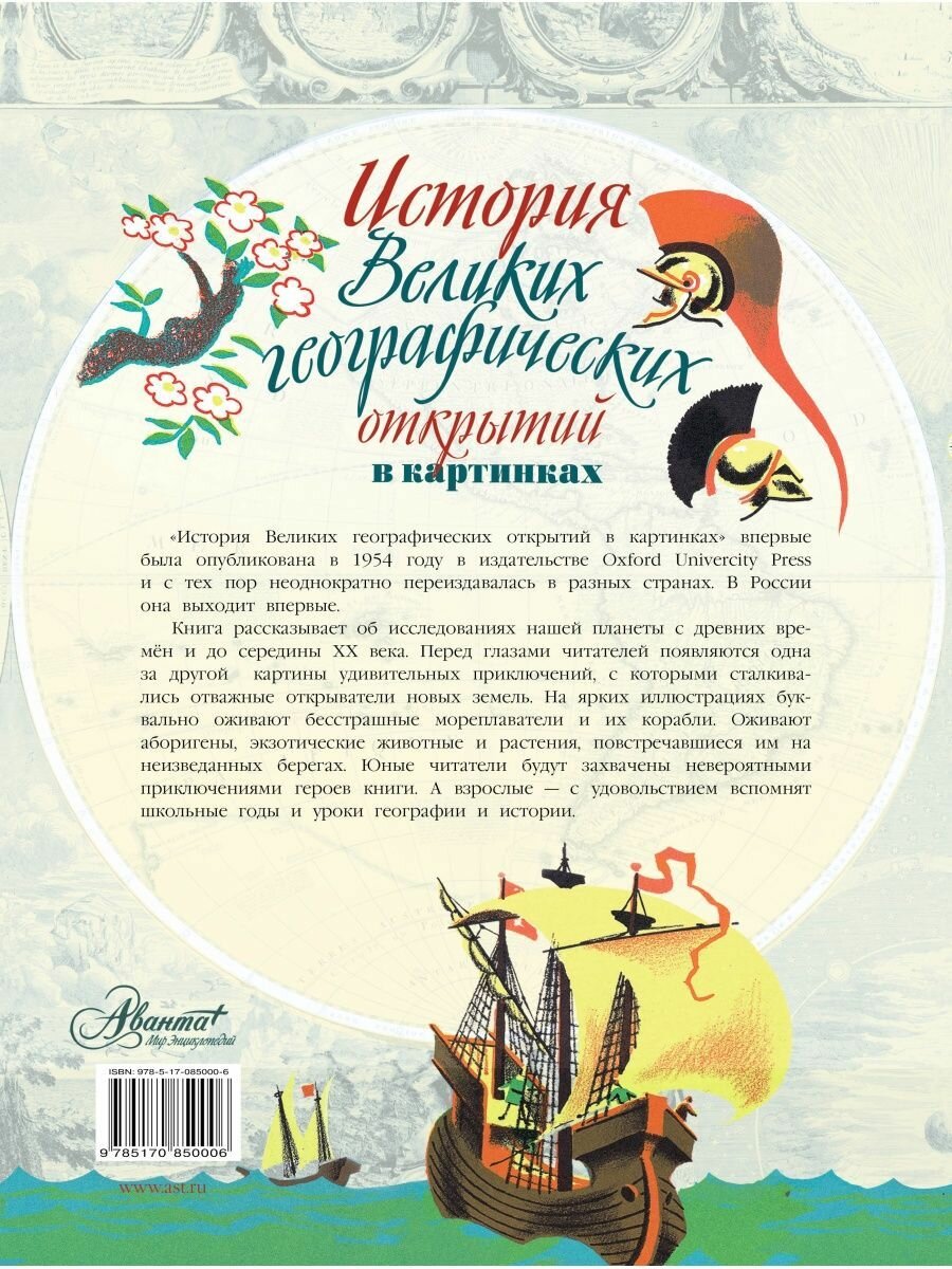 Яркая и красочная книга "История Великих географических открытий в картинках" - один из шедевров издательства Оксфордского университета. Книга рассказывает об исследованиях нашей планеты с древних времён и до середины XX века. Читатель познакомится с невероятными приключениями первооткрывателей неведомых земель, оценит их отвагу, мужество и непоколебимую веру в своё предназначение. Огромную роль в книге играют оригинальные иллюстрации Кларка Хаттона - знаменитого английского педагога и иллюстратора. На ярких иллюстрациях Кларка Хаттона буквально оживают бесстрашные мореплаватели и их корабли. Оживают аборигены, экзотические животные и растения, повстречавшиеся им на неизведанных берегах. Юные читатели будут захвачены невероятными приключеняими героев книги. А взрослые - с удовольствием всмпомнят школьные годы и уроки географии и истории. Книга адресована детям младшего и среднего школьного возраста.