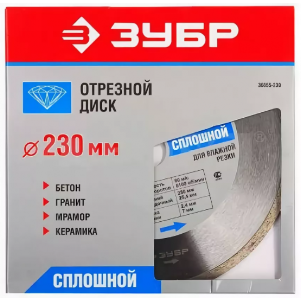 Исключительно высокий уровень качества отрезных алмазных дисков ЗУБР гарантирован комплексной системой контроля всего процесса производства: от качества поступающего сырья до готовой продукции. Корпуса алмазных дисков изготовлены из прочной легированной стали, способной выдержать значительную механическую нагрузку и высокую температуру. Технические характеристики: - Наружный диаметр: 230 мм;- Посадочный диаметр: 25.4 мм.- Высота алмазосодержащего сегмента: 7 мм;- Тип режущей кромки: сплошной. Особенности: - Оригинальная сплошная форма режущей кромки позволяет плавно и безударно осуществлять необходимые резы в обрабатываемом материале и обеспечивает чистый и аккуратный рез без трещин и сколов;- Высококачественные синтетические алмазы;- Оптимально подобранные компоненты металлической связки с высотой сегмента в 7 мм гарантируют продолжительный рабочий ресурс диска при работе даже с самыми сложными в обработке материалами;- Высокая скорость реза и увеличенный рабочий ресурс диска обеспечиваются особой технологией горячего спекания;- Сплошная режущая кромка обеспечивает чистый и аккуратный рез.