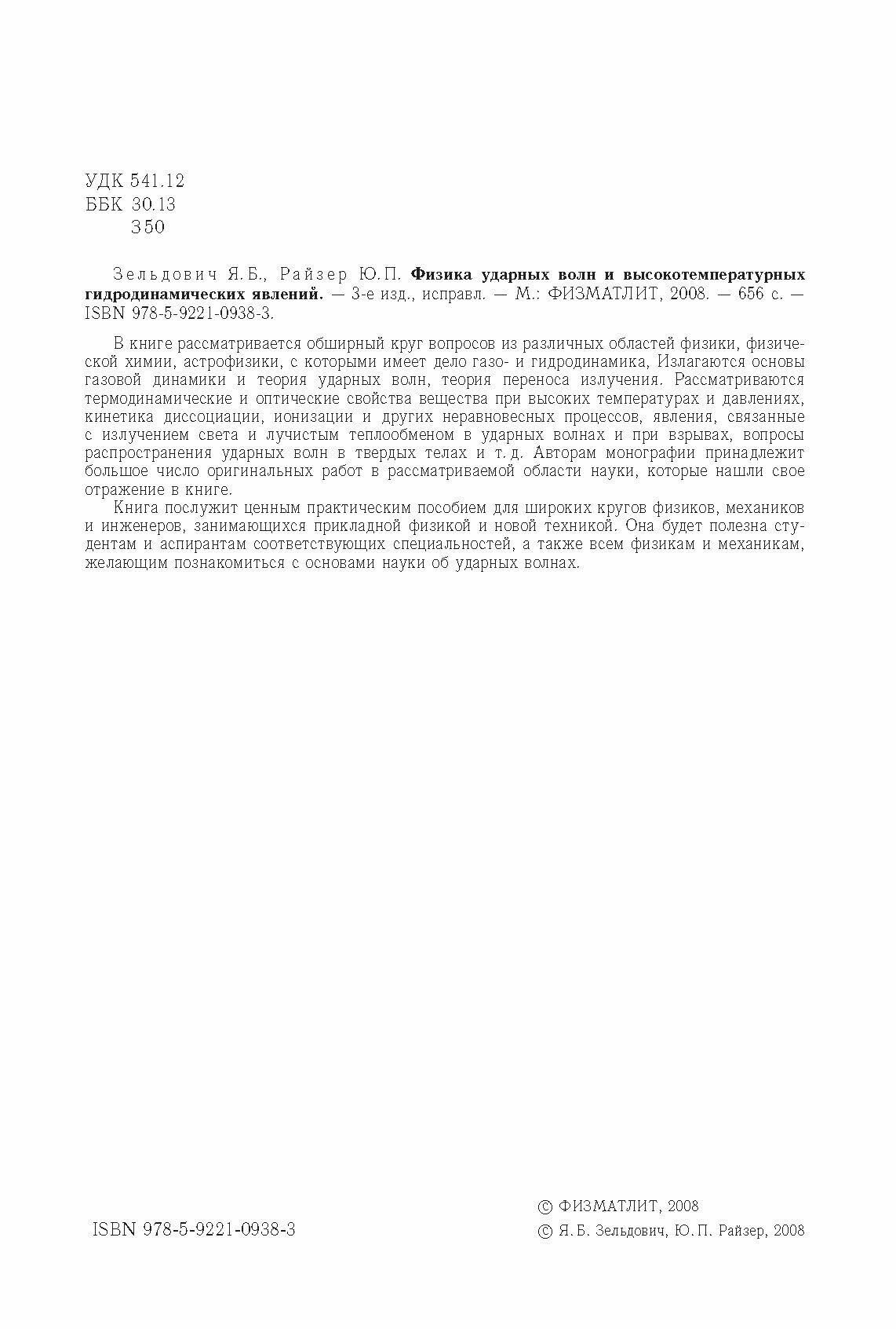 В книге рассматривается обширный круг вопросов из различных областей физики, физической химии, астрофизики, с которыми имеет дело газо- и гидродинамика. Излагаются основы газовой динамики и теория ударных волн, теория переноса излучения. Рассматриваются термодинамические и оптические свойства вещества при высоких температурах и давлениях, кинетика диссоциации, ионизации и других неравновесных процессов, явления, связанные с излучением света и лучистым теплообменом в ударных волнах и при взрывах, вопросы распространения ударных волн в твердых телах и т.д. Авторам монографии принадлежит большое число оригинальных работ в рассматриваемой области науки, которые нашли свое отражение в книге.