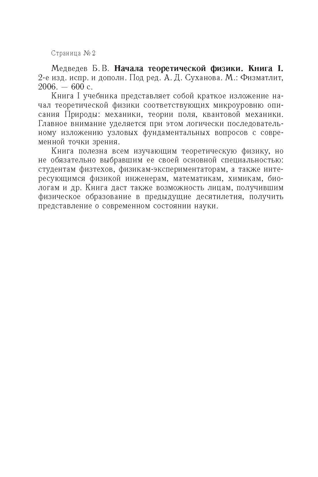 Книга представляет собой краткое изложение начал теоретической физики. Главное внимание уделяется при этом логически последовательному изложению узловых фундаментальных вопросов с современной точки зрения. Книга будет полезна всем изучающим теоретическую физику, но не обязательно выбравшим ее своей основной специальностью: физикам-экспериментаторам, а также интересующимся физикой инженерам, математикам, химикам, биологам и другим. Допущено Министерством образования и науки Российской Федерации в качестве учебного пособия для студентов высших учебных заведений, обучающихся по физико-техническим и инженерно-физическим направлениям подготовки и специальностям.