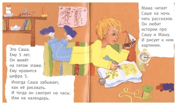 История про пятилетнего мальчика Сашу, его ежедневные занятия, игры проиллюстрирована замечательными рисунками Насти Варнавской.