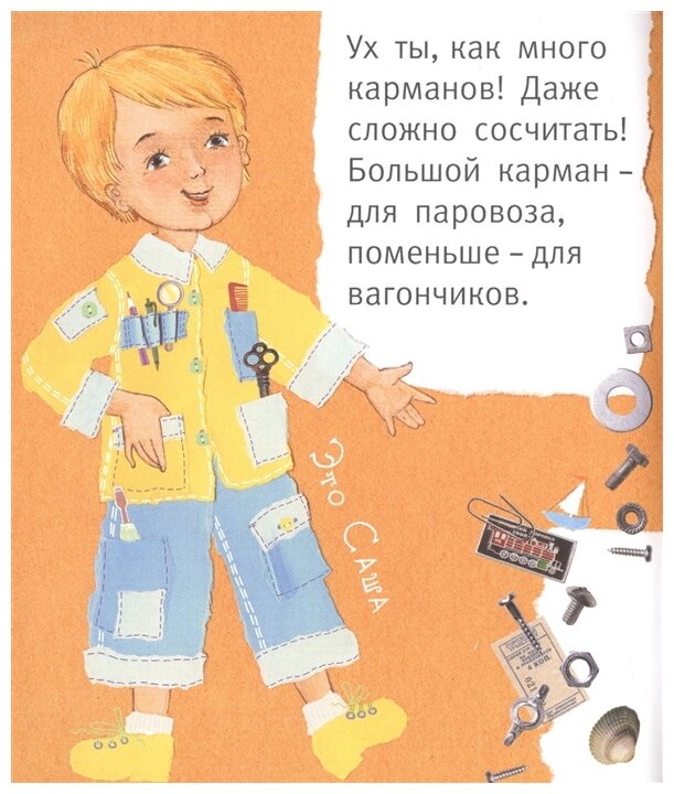 В этой книжечке небольшого формата на двадцати с лишним страницах рассказывается о разных затеях мальчика Сашки, которому мама на день рождения подарила синие штанишки с кармашками. И в этих кармашках чего только у Сашки нет! И гвоздики, и гаечки, и карандаш, и отвертка, и веревочки, и даже паровозик с корабликом - все это нужно Сашке для разных игр, которые он придумывает на ходу. Придумывает очень много, можно долго и засозабвенно играть, используя его идеи.
