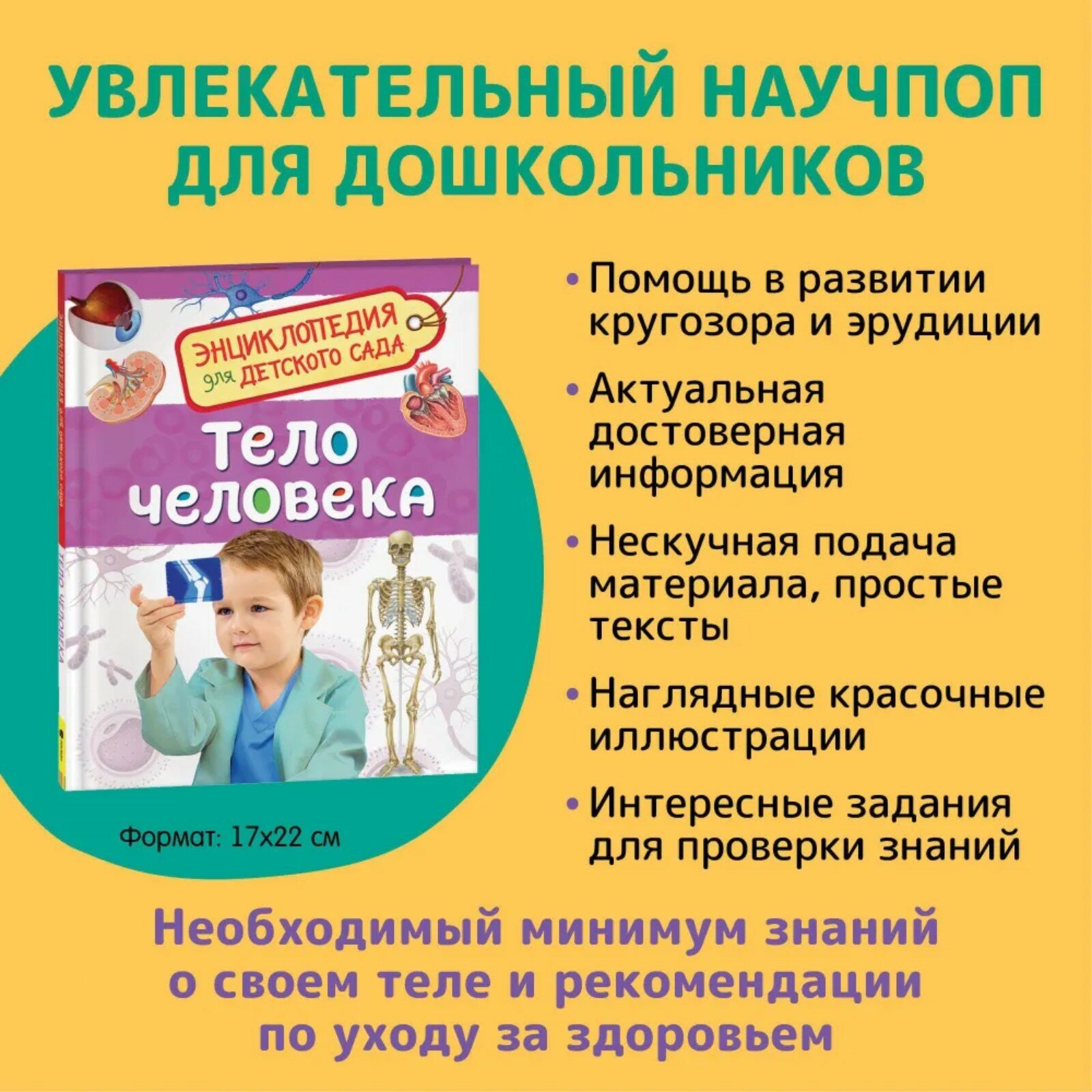 Книгу заказала по просьбе подруги для ее мелкого сынка 3х лет. В восторге и подруга и сынок. Яркие картинки, плотная бумага, твердая обложка. Приятно держать в руках. Перед тем, как отдать заказ подруге, я сама прочла всю книгу за чашкой гляссе в кафе. Даже мне было интересно, вполне информативно. С ее помощью ребенок, я думаю, куда быстрее выучит строение тела человека. Рекомендую.