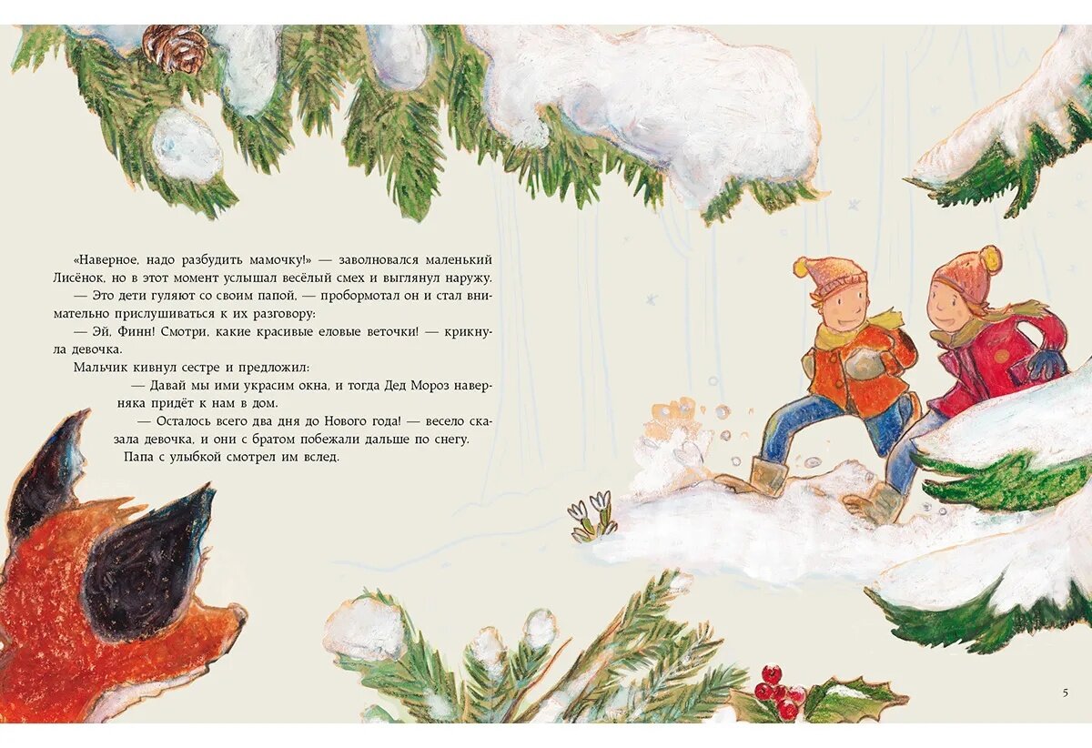 Книга формата чуть больше A4, очень хорошее качество печати, яркие картинки. Эта история о лисенке, который выглянул из своей норки и увидел детей гулявших по лесу с папой, дети разговаривали про новый год, до которого осталось всего два дня, лисенку стало очень интересно что же такое новый год и кто такой дед мороз и он побежал расспрашивать лесных зверей. Я думаю эта история понравится и совсем малышам и деткам чуть постарше, моей дочке два с половиной года и она просто в восторге от этой книжки, просит перечитывать её снова и снова))