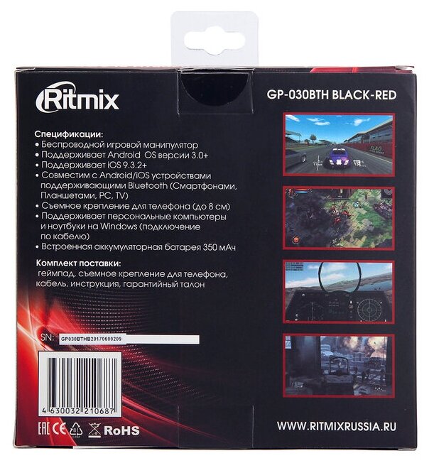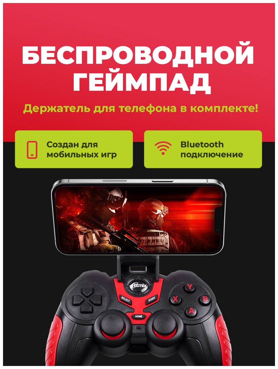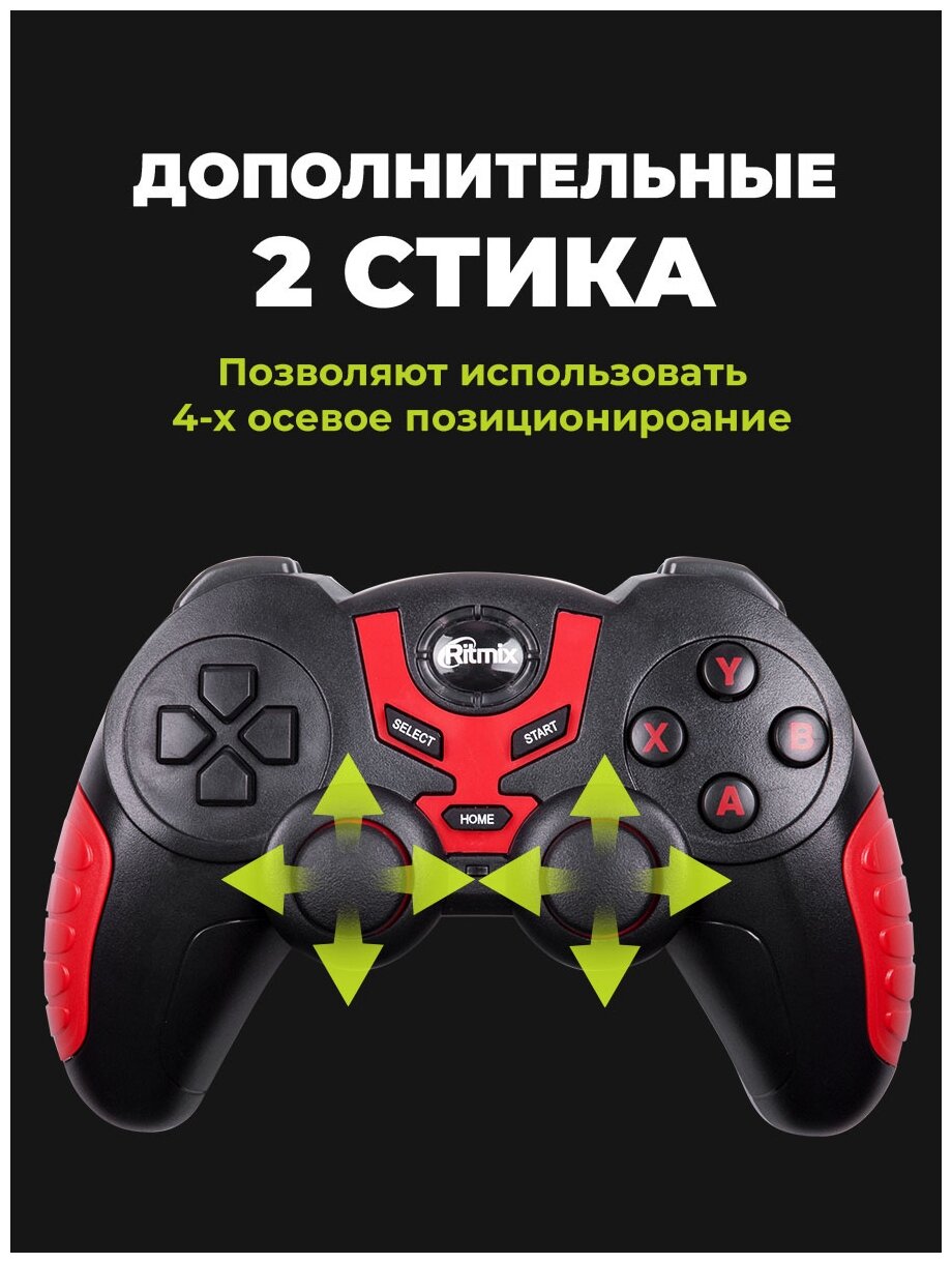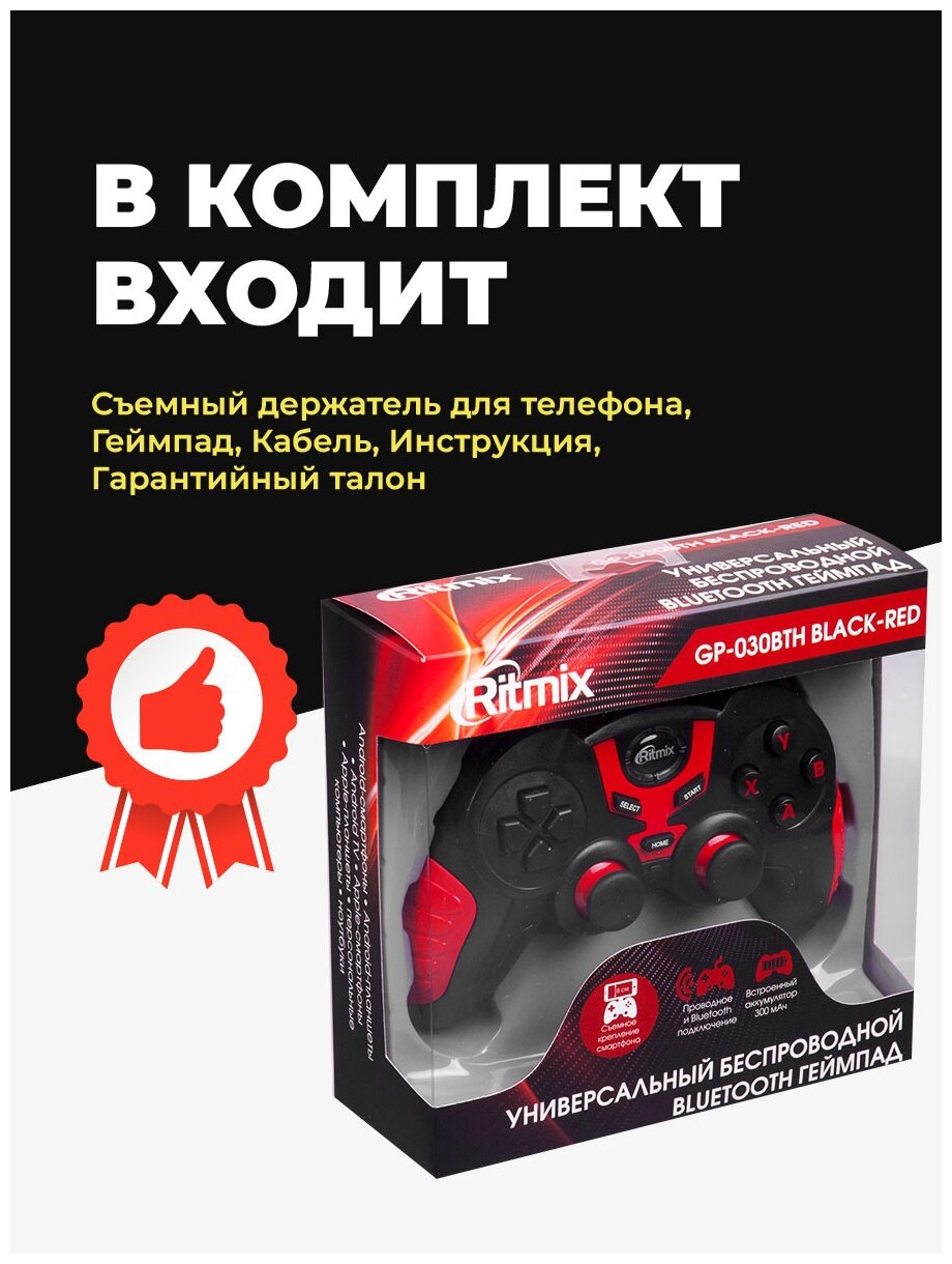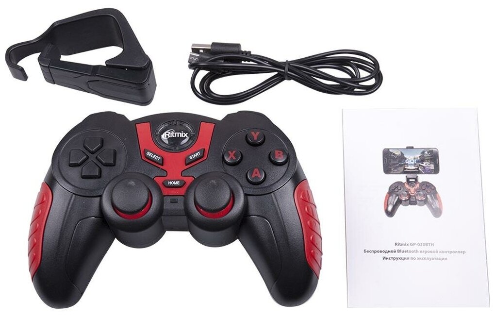 Ritmix GP-030BTH – беспроводной геймпад, совместимый с устройствами, которые работают под управлением ОС Android и iOS. Также вы можете использовать кабель, чтобы подключить его к компьютеру с ОС Windows.