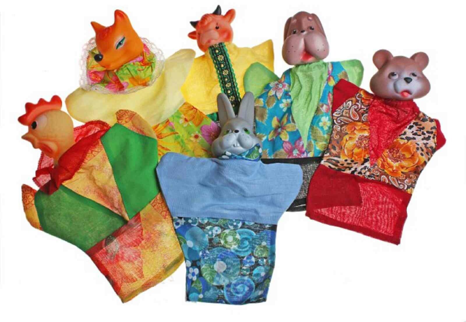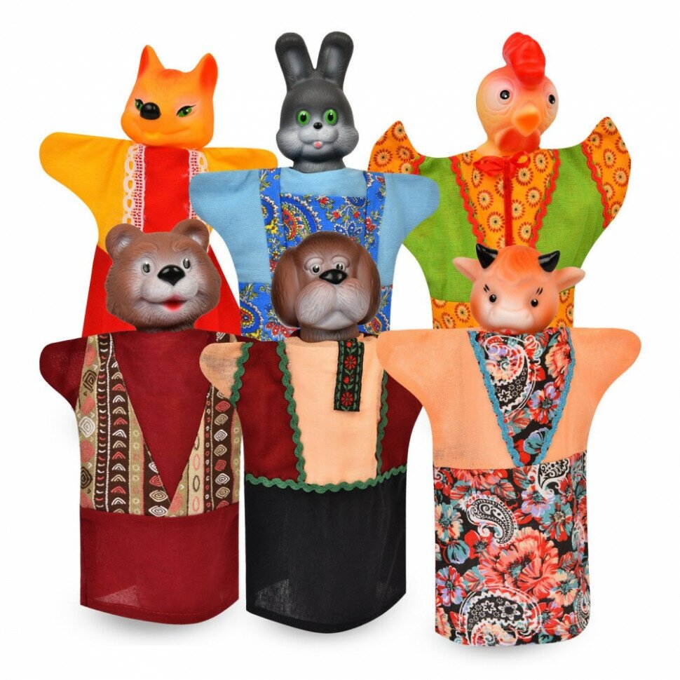 В этом наборе 6 персонажей – героев одноименной сказки: заяц, лиса, собака, бык, медведь и петух. Куклы одеты в нарядные одежки, головы у них сделаны из мягкой резины. Хорошо сидят на взрослой и детской руке. Сценарий в комплекте. От года.