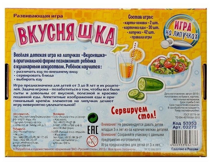 Сервис сравнения цен СкидкаГИД предлагает сравнить цены на товар «Развивающая игра на липучках Русский Стиль Вкусняшки Игра на липучках Вкусняшки»