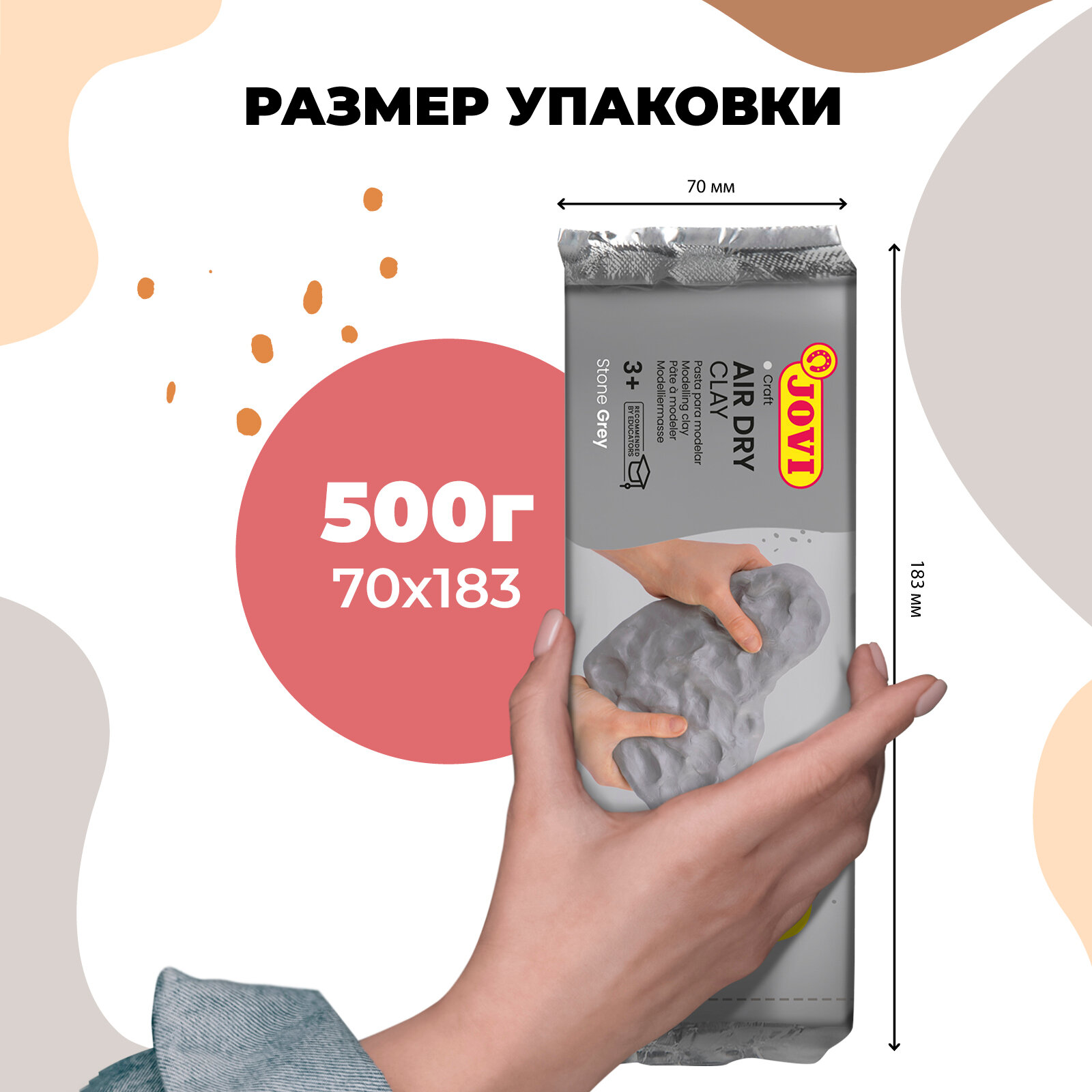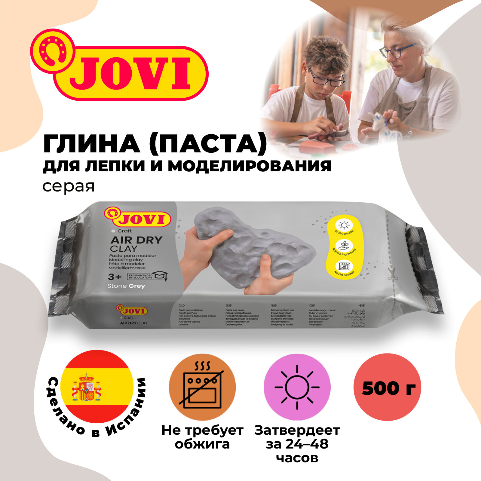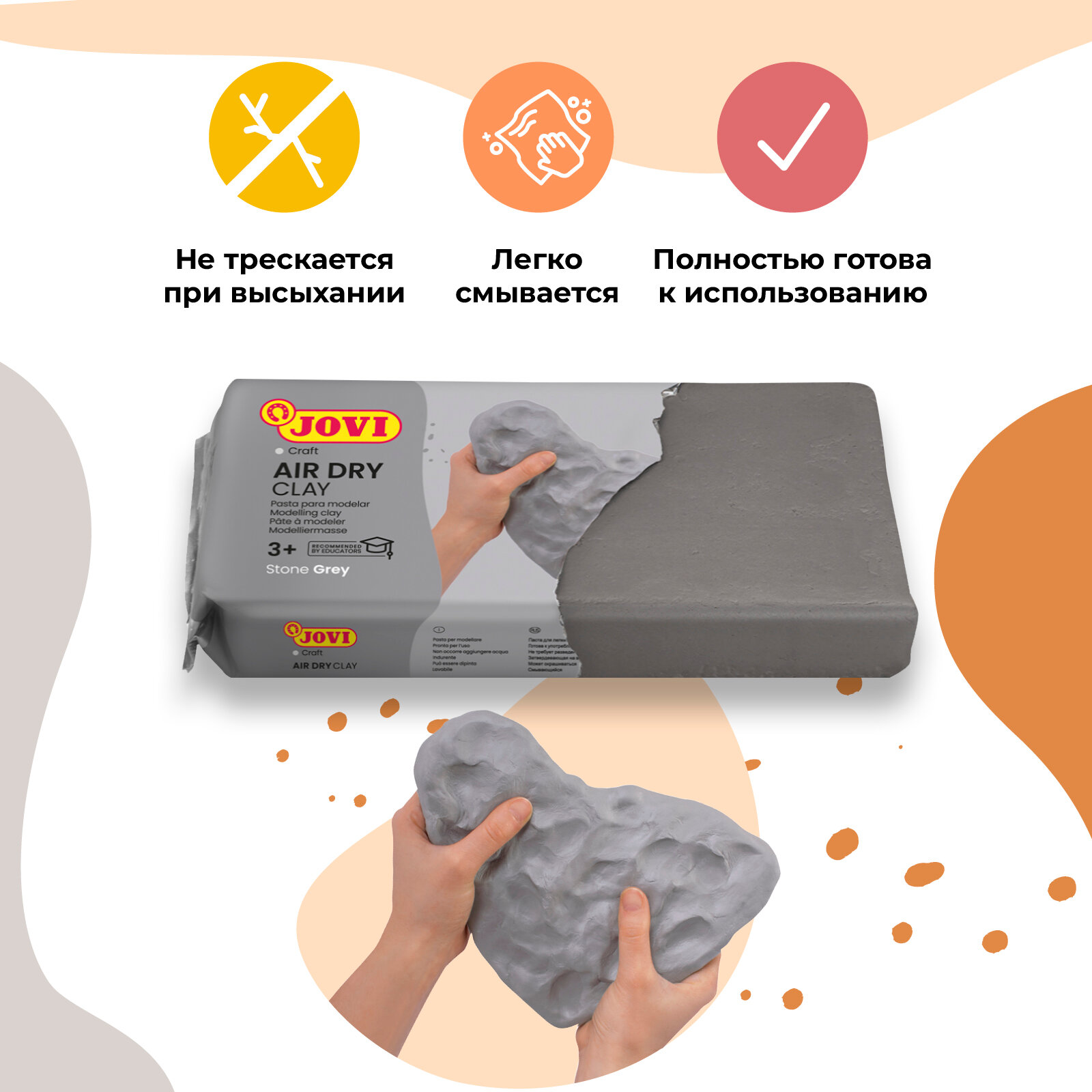Паста для лепки и моделирования JOVI Air Dry 500 гр., отвердевающая на воздухе. Цвет пасты серый. Паста (пластика) полностью готова к использованию, по своим свойствам напоминает глину, но работать с ней легче. Моделируется руками, при необходимости можно использовать специальные стеки и инструменты. Паста JOVI Air Dry пластична, легко лепится, раскатывается, режется, принимает любую форму, не липнет к рукам. Затвердевает на воздухе, после высыхания становится очень прочной, не трескается. Время затвердевания JOVI Air Dry зависит от температуры воздуха и уровня влажности в помещении и составляет от 24 до 48 часов. Готовое изделие можно расписывать красками и декорировать в различных техниках. Отлично подойдет для лепки дома, в школе, художественных студиях и для профессионального использования. JOVI Air Dry легко смывается с рук, одежды и рабочих поверхностей. Основной состав: вода, карбонат кальция, целлюлоза, каолин.