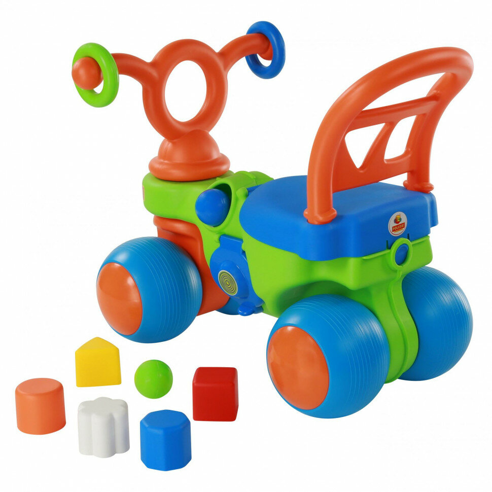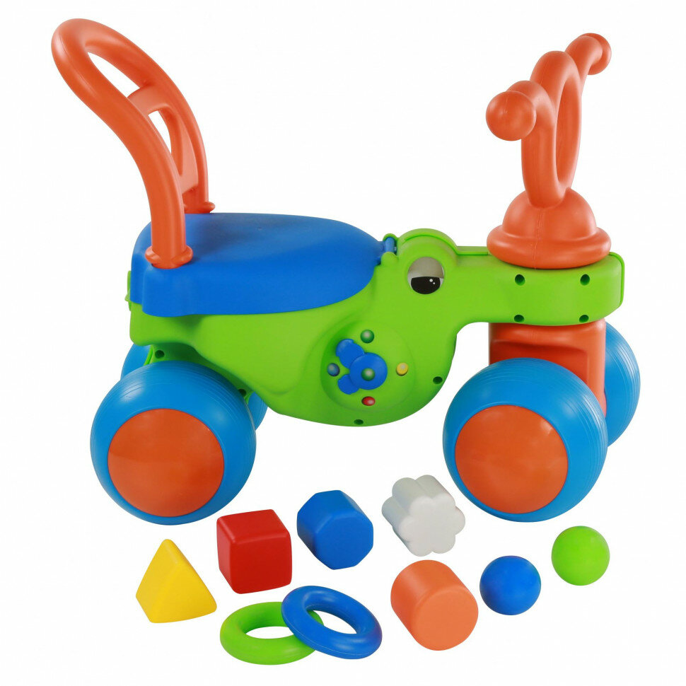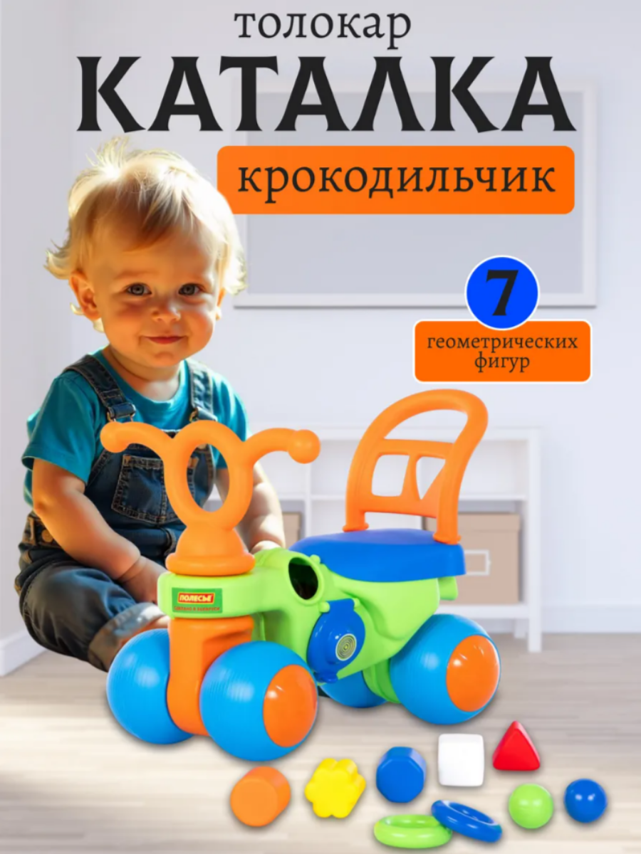 У каталки большие, крепкие колёса необычной формы, удобный руль, большой багажник под сиденьем. Руль, спинку и корпус каталки можно использовать как сортёр. В комплект входят семь разноцветных геометрических форм.