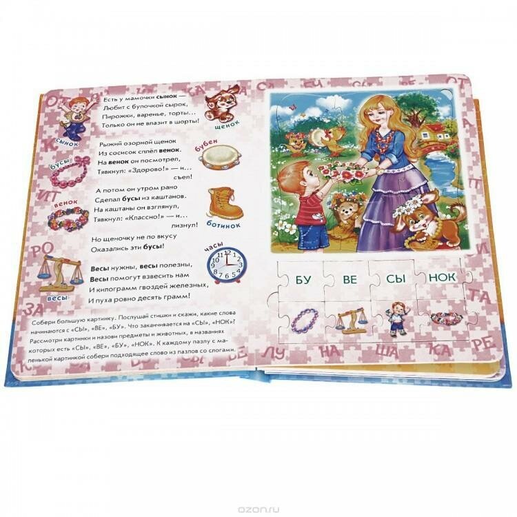 "Большие книги пазлов" посвящены самым важным темам в обучении ребёнка. Чтобы заинтересовать ребёнка процессом обучения в книжках используется игра в пазлы. На каждом из восьми разворотов книжки ребёнок найдёт (в зависимости от темы) интересные стихи и даже стихотворные задачки, огромное количество иллюстраций, 64 маленьких пазла со слогами и соответствующие им пазлы с картинками, а также большие картинки. Играя с этими книжками, малыш сможет не только слушать стихи и рассматривать картинки, но и собирать 8 картинок-пазлов и играть с маленькими пазлами. Подарочное оформление обложки!