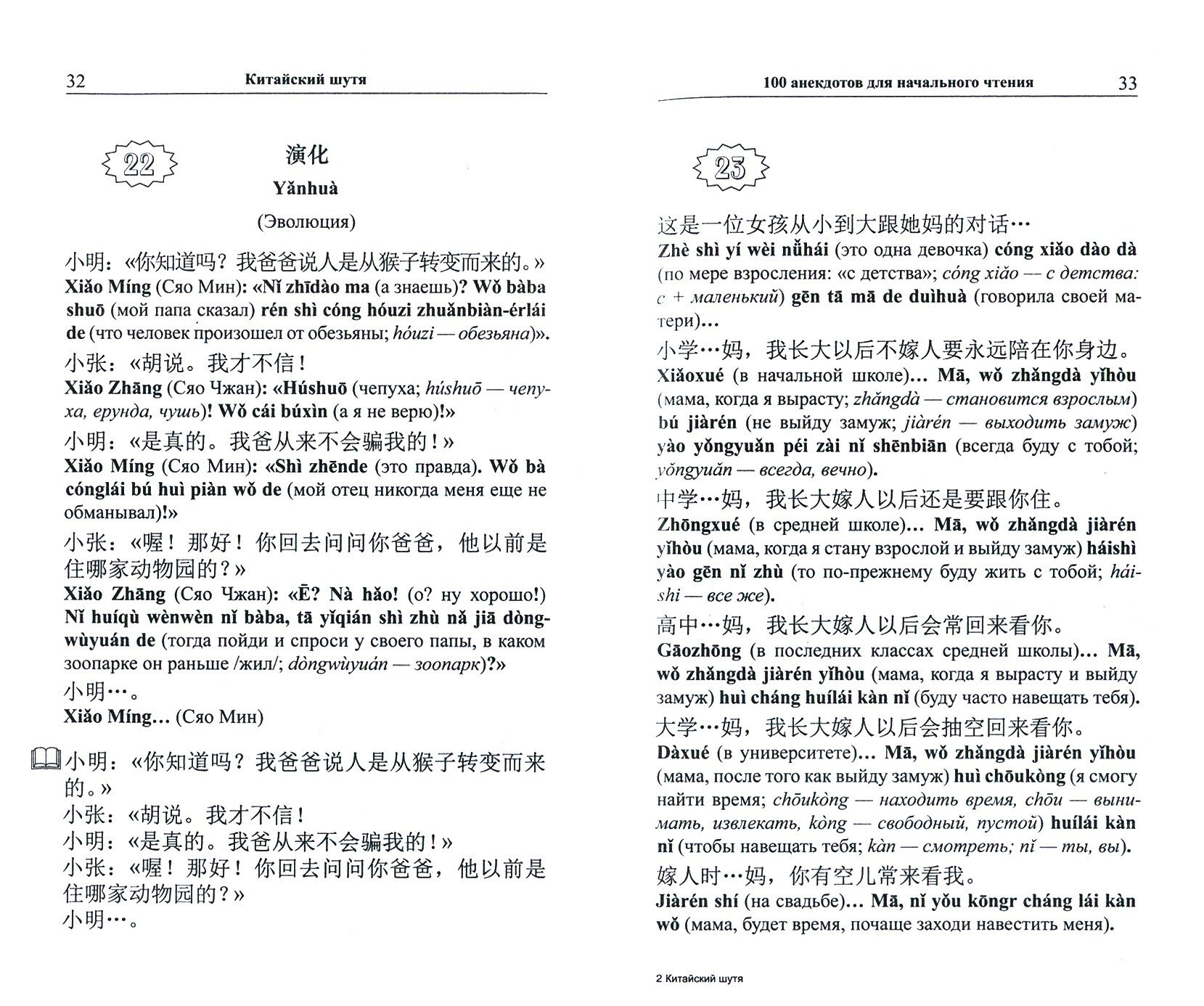 Книга включает в себя сто китайских анекдотов, адаптированных (без упрощения текста оригинала) по методу Ильи Франка: снабженных транскрипцией, дословным переводом на русский язык и необходимым лексико-грамматическим комментарием.