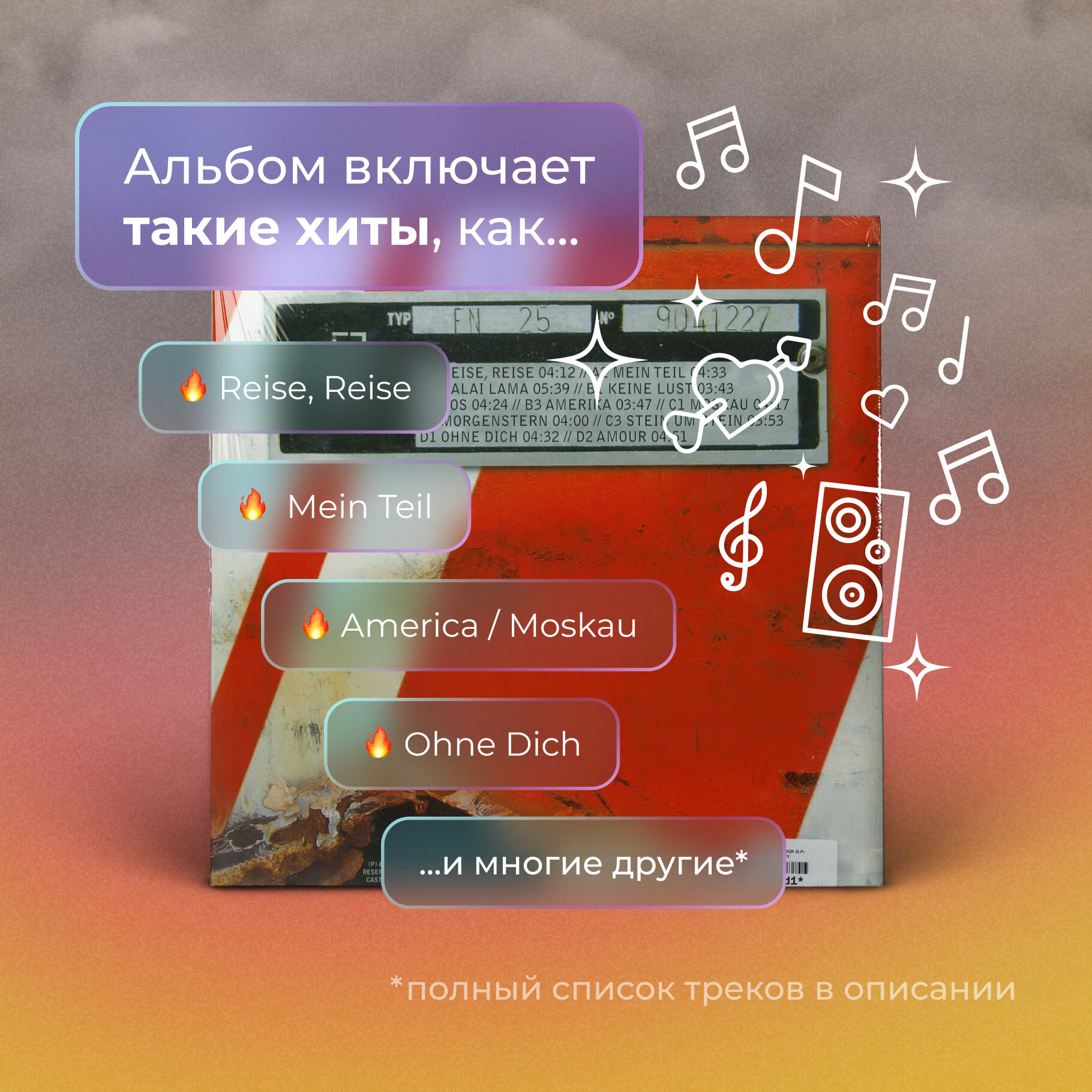 Абсолютно новый, запечатанный в заводскую плёнку альбом Рамштайн, состоящий из двух 180-граммовых виниловых пластинок. Внутри 16-страничный буклет, конверт с разворотом (гейтфолд)_____________________________________Лейбл: Universal Music GroupКаталожный номер: 2729672Формат: 2 x Пластинки, LP, Album, Reissue, Remastered, Stereo, 180gДата первого релиза: 27 сентября 2004 г.Дата издания: 8 декабря 2017 г.Жанр: Electronic, RockСтиль: Industrial MetalСостояние: новый / запечатанный винил / Still Sealed / sealed / SS / NEW_____________________________________Трек-лист:A1 Reise ReiseA2 Mein TeilA3 Dalai LamaB1 Keine LustB2 LosB3 AmerikaC1 MoskauC2 MorgensternC3 Stein Um SteinD1 Ohne DichD2 Amour