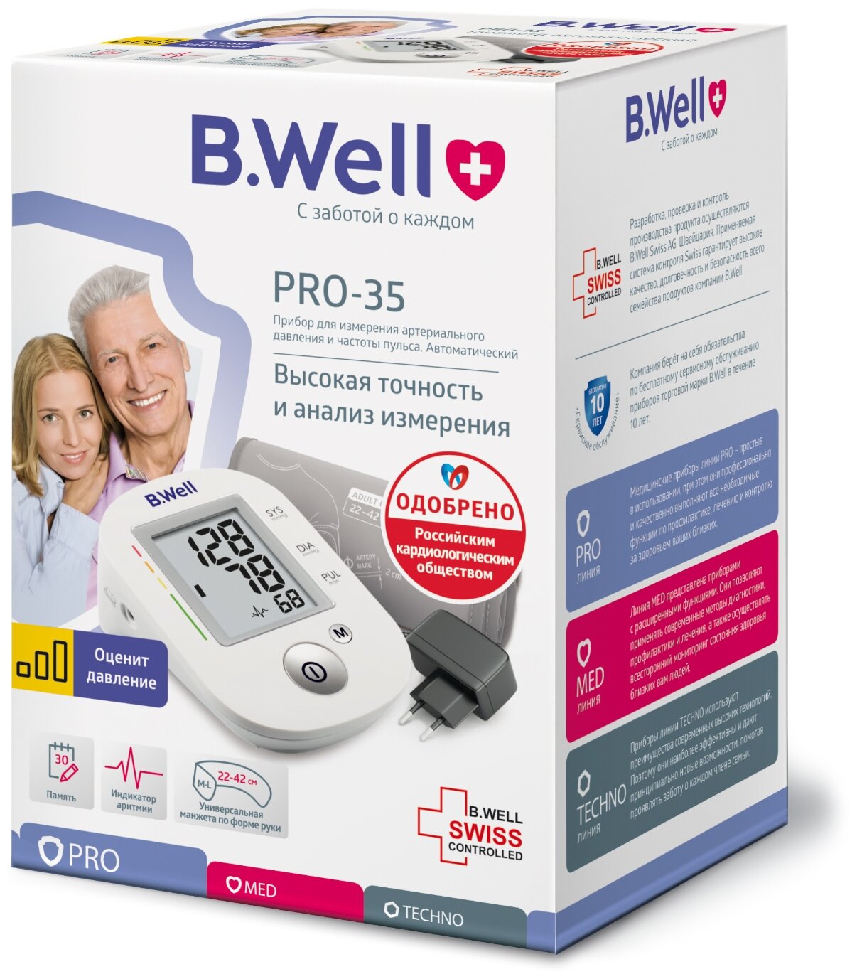B.Well PRO-35 – автоматический тонометр с большим набором функций: индикатором аритмии, технологией Intellect Classic, памятью на 30 измерений, шкалой диагностики ВОЗ. Конусная универсальная манжета (22-42 см) и сетевой адаптер в комплекте.