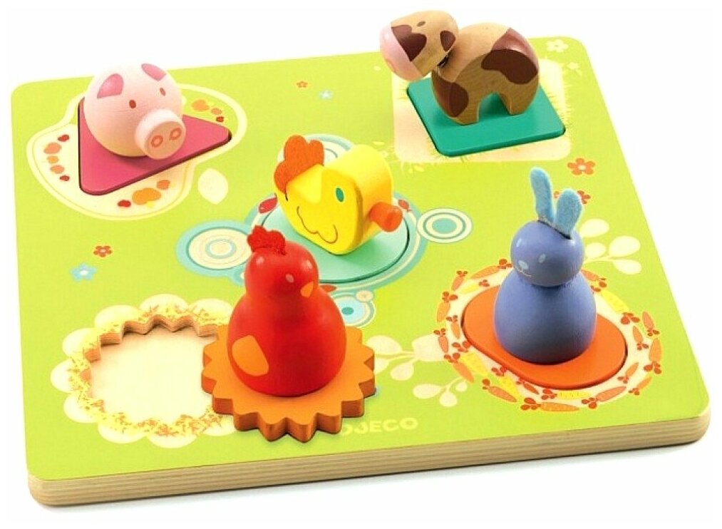 Пазл - сортировка Утка и друзья от французской компании Djeco - прекрасная развивающая игрушка для самых маленьких. На деревянной основе есть отверстия, в которые ребенку нужно вставить подходящую фигурку животного на подставке. Играя с сортировкой, малыш научится распознавать и сопоставлять различные геометрические формы, цвета, а также познакомиться с тем, как выглядят поросенок, корова, утка, заяц и цыпленок. Фигурки имеют обтекаемую форму, приятны на ощупь, удобны для захвата маленькими детскими ручками. Игрушка выполнена из высококачественного дерева, покрыта нетоксичными безопасными для здоровья малыша красками. Французская компания Джеко производит развивающие игрушки и игры для детей, а также наборы для творчества и детали интерьера детской комнаты. Все товары Джеко отличаются высочайшим качеством, необычной идеей исполнения. Изображения и дизайн специально разрабатываются молодыми французскими художниками.