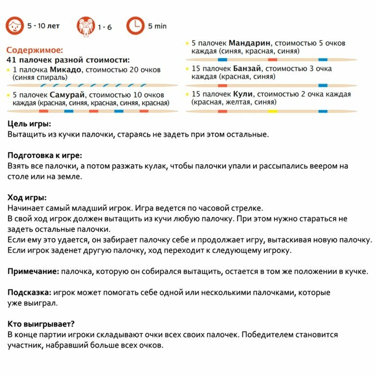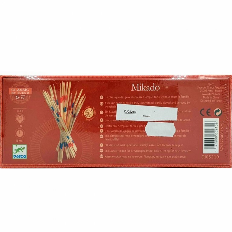 Веселая и увлекательная игра на ловкость для всей семьи - Микадо от французской фирмы Djeco (Джеко). Правила игры просты и подходят для всей семьи. Достаём палочки, устанавливаем хаотичную кучку. Кто установил сооружение, тот первый ходит. Игроки по очереди вытягивают палочки из кучки таким образом, чтобы не развалить её. Каждой палочке присваивается количество очков в зависимости от рисунка на ней. Кто больше очков собрал до того, как пирамида рухнет, тот и победитель. Можно усложнить правила и играть только одной рукой. Если коснулся палочки пальцем, значит её и должен вытаскивать. Игра способствует развитию мелкой моторики детских ручек, учит ловкости и сноровке, а также логическому мышлению. Игра рассчитана на 1-6 игроков. В игру Микадо будет не скучно играть как самостоятельно, так и в веселой компании! Игра продается в яркой подарочной коробке, в которой можно будет хранить палочки. Палочки изготовлены из высококачественной древесины, безопасной для ребенка.