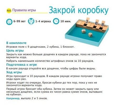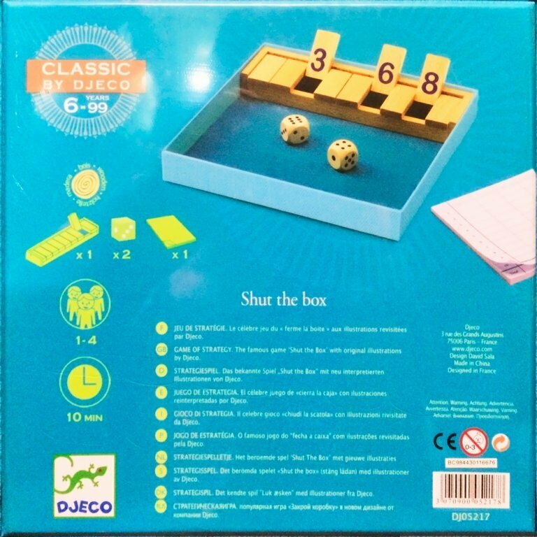 Настольная игра Открой коробку - неустаревающая классика от французского производителя Djeco! Обновленная версия классической игры, в которой ребенку понадобится одновременно удача и стратегическое мышление. В игру можно играть в одиночку, вдвоем или компанией. Для того, чтобы выиграть, игрок должен закрыть все пронумерованные ящички на доске, или получить наименьшее общее количество когда все пронумерованные ящички добавлены. Как играть: каждый игрок по очереди кидает кубики и закрывает число номеров, соответствующее сумме точек на кубиках. Таким образом, если общее число точек равно 7, игрок может закрыть любую комбинацию номеров: 7, 5 и 2, 4 и 2 и 1 и так . Удача должна быть на вашей стороне но вы также должны следить за своими числами!