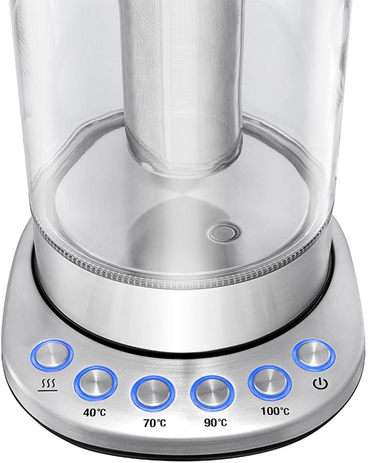 Оптимальный объем 1,7 л. Быстро и малошумно закипает, при готовности сигнализирует звуковым сигналом. Удобная функция подогрева (например при кормлении детей). Прозрачный корпус позволяет легко контролировать наличие воды. Широкая горловина, что удобно при наборе воды и мытье. Наличие чаезаварочного механизма полезно в большой семье, очень мелкая сетка не пропускает чаинки. При заваривании разных сортов чая можно выбрать разную температуру заваривания.