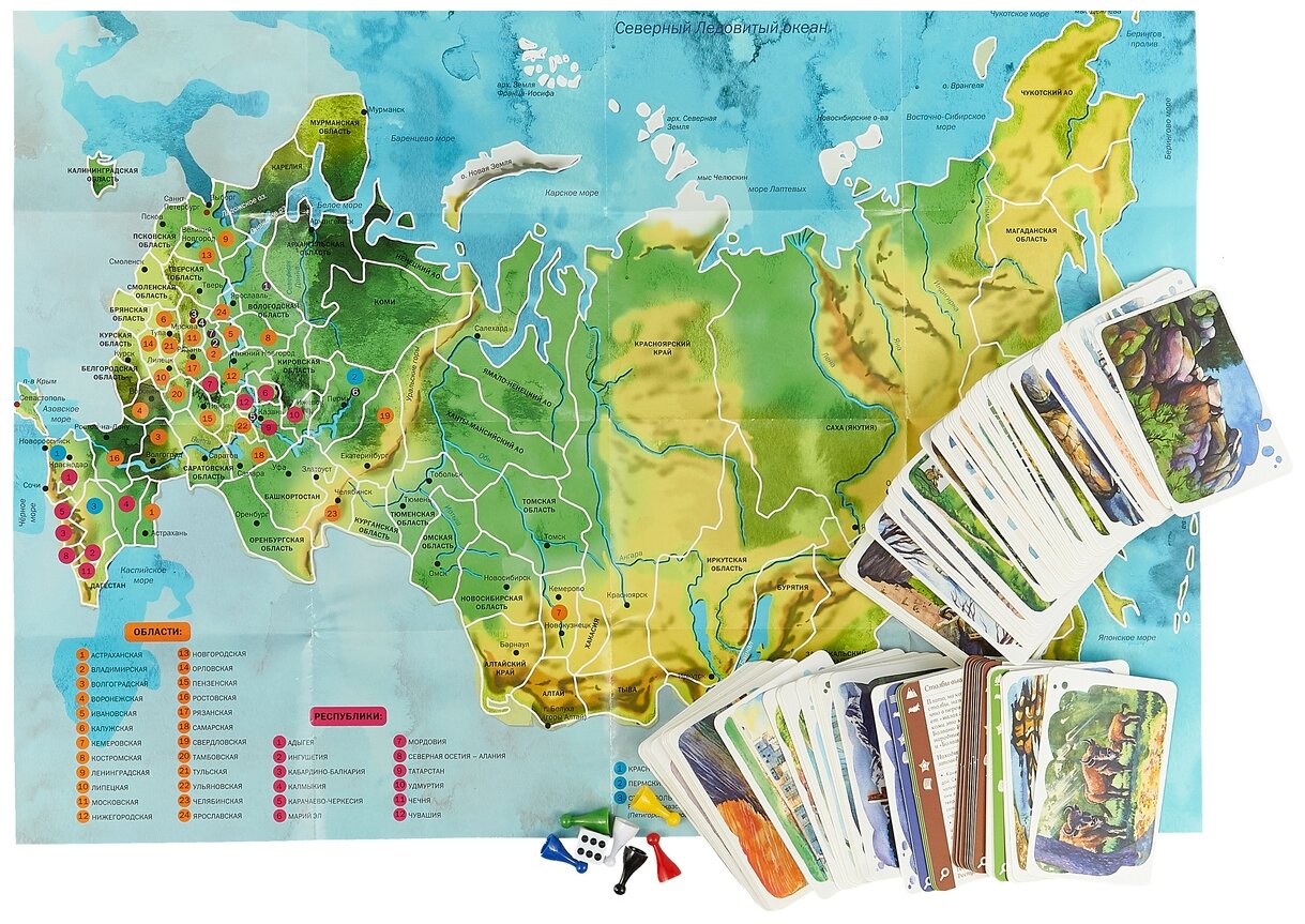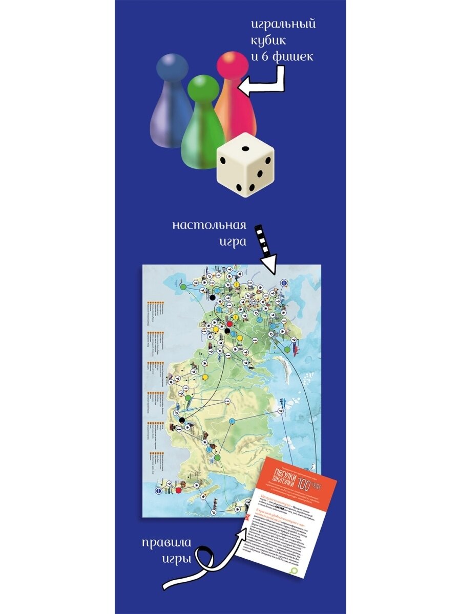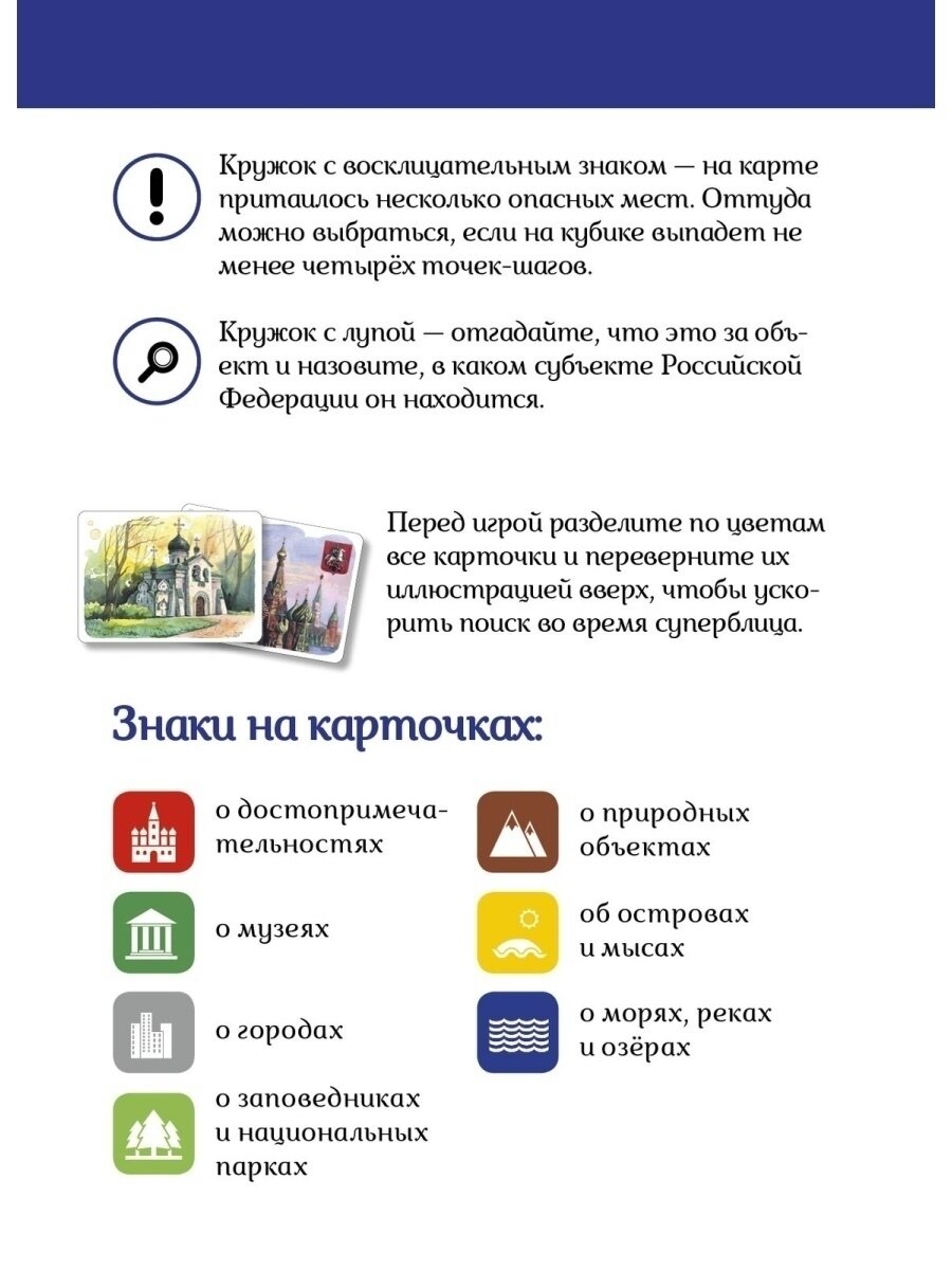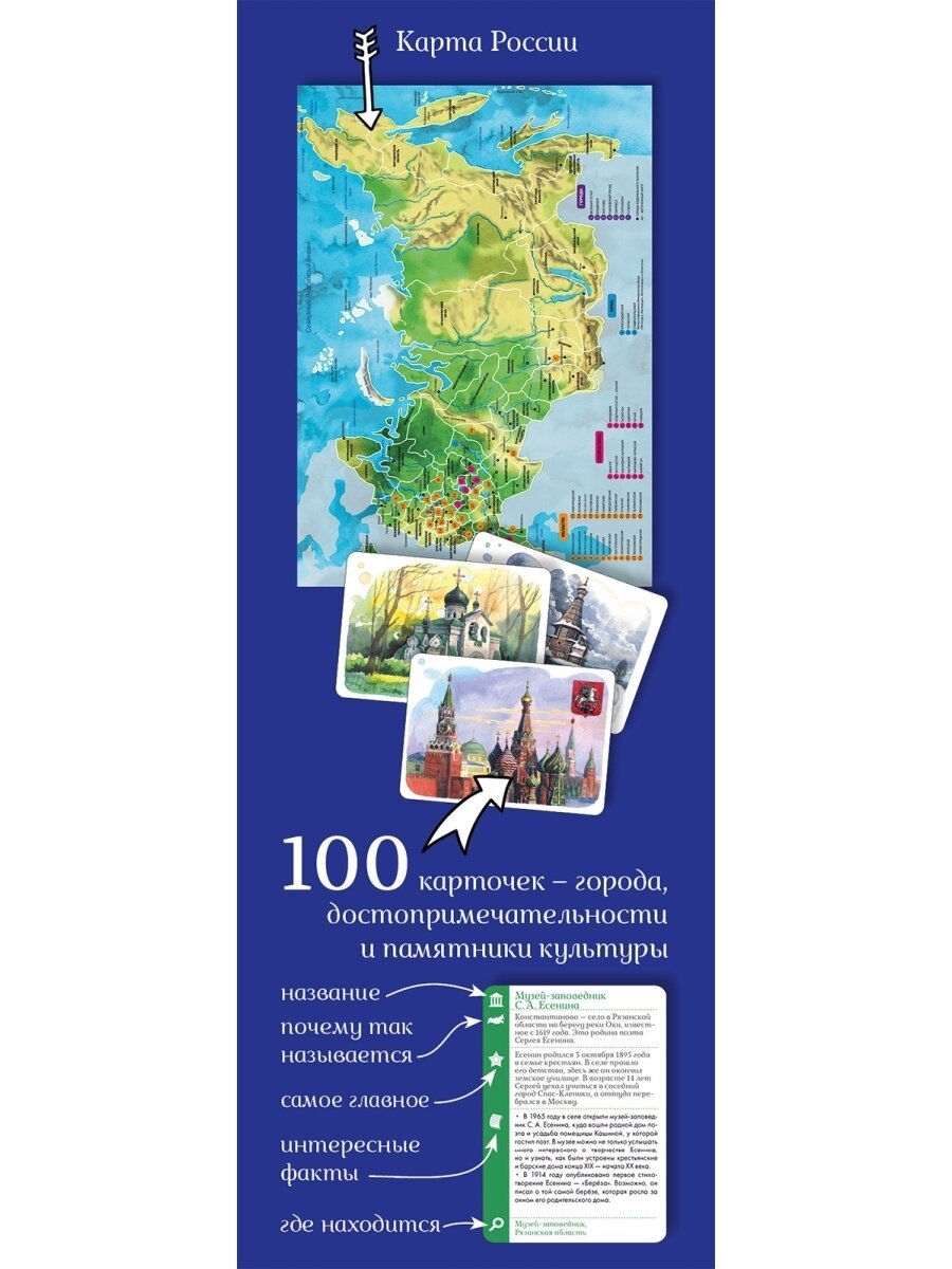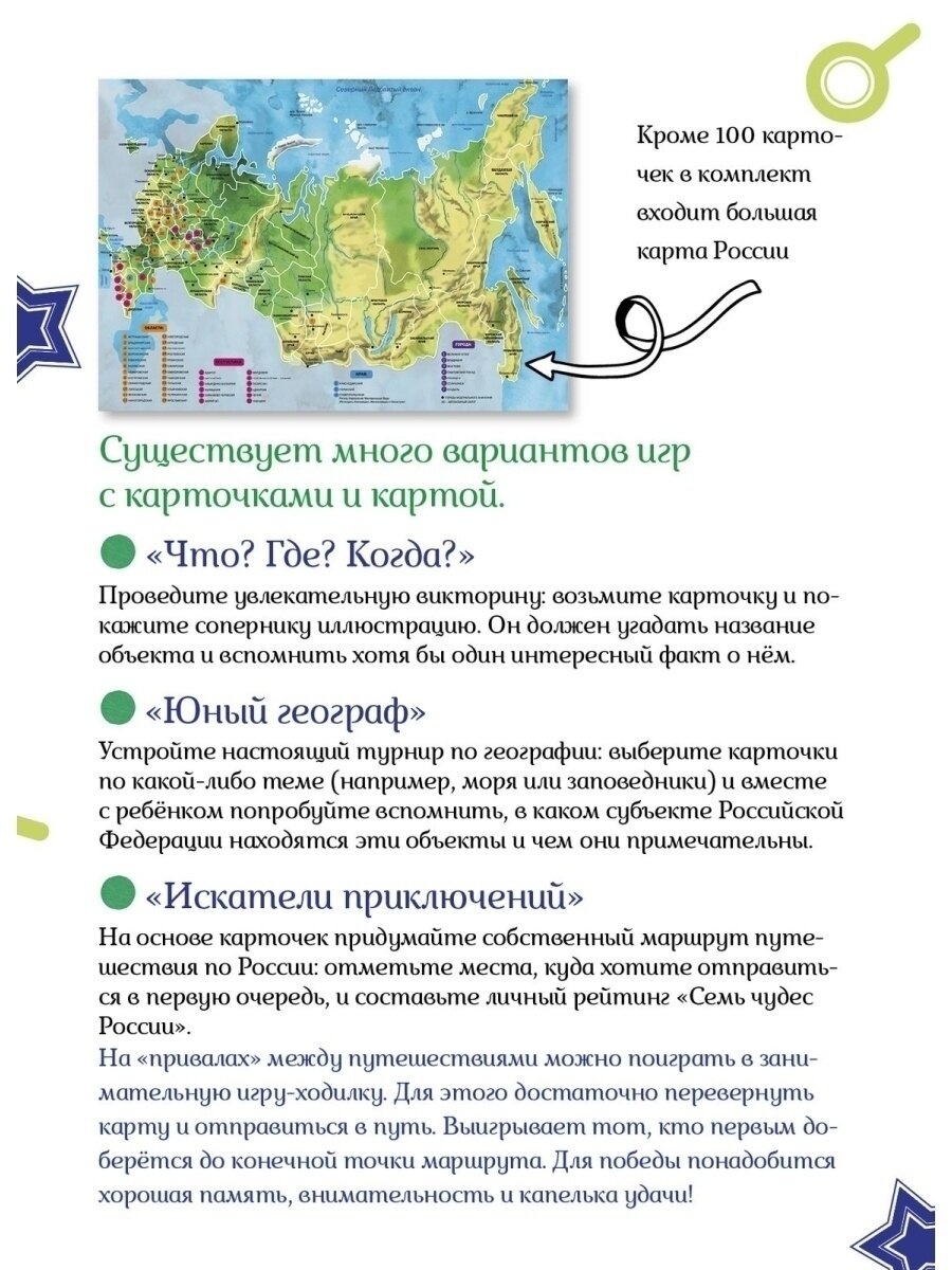 Совершите увлекательное путешествие по России, не выходя из дома! В этой чудесной шкатулке вы найдете 100 иллюстрированных карточек с интересными фактами: о достопримечательностях, о музеях, о городах, о заповедниках, о природных объектах, о морях, реках и озерах. Что в наборе: 100 карточек — города, достопримечательности и памятники культуры Настольная игра Карта России 6 фишек и кубик Брошюра с правилами игры На обороте карточки дана главная информация — в каком регионе России расположен объект, как и почему он так называется. Также вы узнаете, чем знаменито и уникально это место. На каждой карточке есть специальный раздел, задача которого очень коротко и ясно представить образ объекта, чтобы он надолго остался в памяти. Игра «Путешествие по России. 100 открытий» Перед игрой разделите по цветам все карточки и переверните их картинкой вверх, чтобы ускорить поиск во время супер-блица. Правила просты, как и в любой игре-ходилке, но у каждого будет свой уникальный маршрут! Путешествие будет долгим, потому что по пути вам придется выполнять разные задания и преодолевать препятствия. Игроки по очереди бросают кубик и продвигают свои фишки на столько шагов, сколько выпало точек. Выигрывает тот, кто первым пройдет весь маршрут по нашей необъятной стране — от Калининграда до Владивостока. Для победы понадобится хорошая память, внимательность и сообразительность. Существует много вариантов игр с карточками и картой: «Что? Где? Когда?» Проведите увлекательную викторину: возьмите карточку и покажите сопернику иллюстрацию. Он должен угадать название объекта и вспомнить хотя бы один интересный факт о нём. «Юный географ» Устройте настоящий турнир по географии: выберите карточки по какой-либо теме (например, моря и заповедники) и вместе с ребенком попробуйте вспомнить, в каком субъекте Российской Федерации находятся эти объекты и чем они примечательны. «Искатели приключений» На основе карточек придумайте собственный маршрут путешествия по России: отметьте места, куда хотите отправиться в первую очередь, и составьте личный рейтинг «Семь чудес России». В зависимости от возраста ребенка можно увеличить или уменьшить количество фактов, которые он должен назвать. Если ребенок не знаком с этим объектом, предложите ему просто прочитать текст на карточке.
