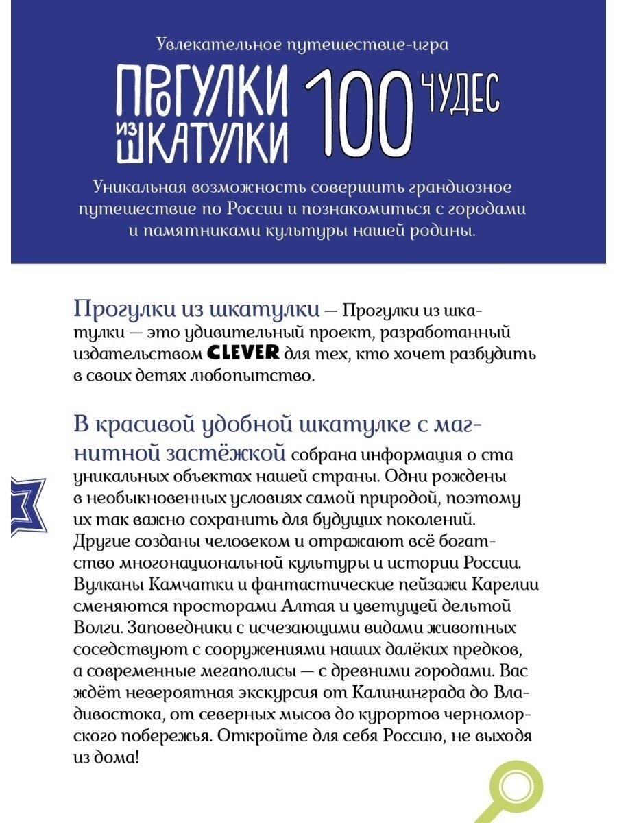 Книга для детей Clever Прогулки из шкатулки. 100 чудес России (размер: 180*177*30)