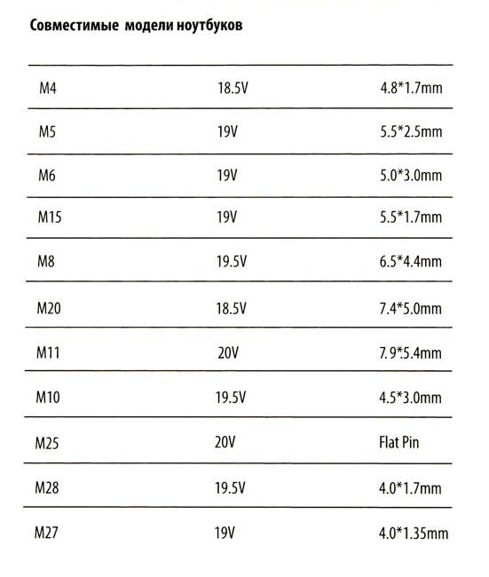 | Напряжение на выходе | 9.5 В, 12 В, 16 В, 18.5 В, 19 В, 19.5 В, 20 В |