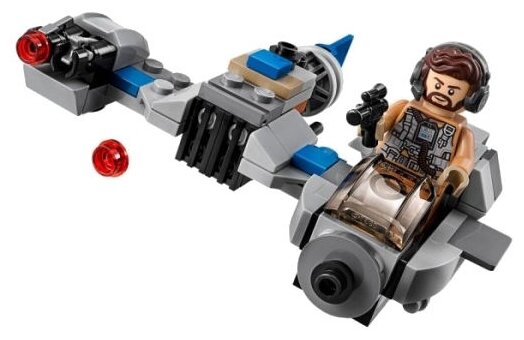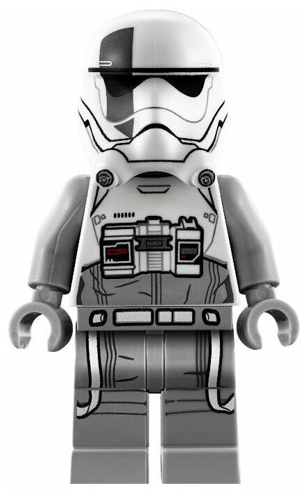В кабине пилота на сидение можно усадить минифирку пехотинца Первого ордена. Он одет в традиционный белый костюм с маской. Маская является отдельной деталью, и ее можно снять. Тогда вы увидите разъяренное лицо штурмовика. Боец Первого ордена держит в руке бластер, что позволяет ему отстреливаться от противников.