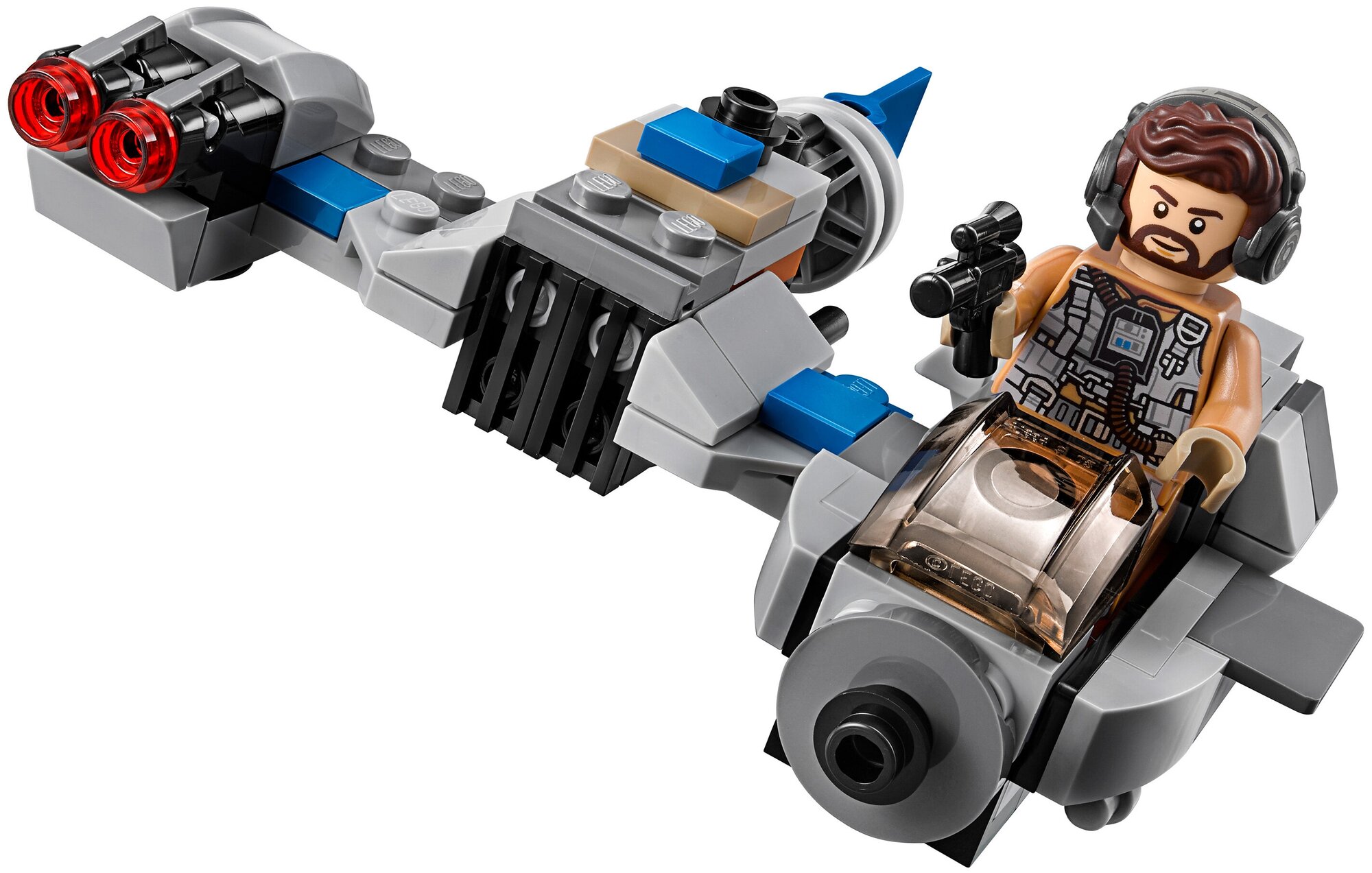 В кабине пилота на сидение можно усадить минифирку бойца Сопротивления. Он одет в коричневый костюм, на теле обозначен интересный принт жилета. Съемная деталь прически у этой минифигурки интересная и необычная, ведь на нее также надеты наушники. Боец сопротивления держит в руке бластер, что позволяет ему дополнительно отстреливаться от врагов.