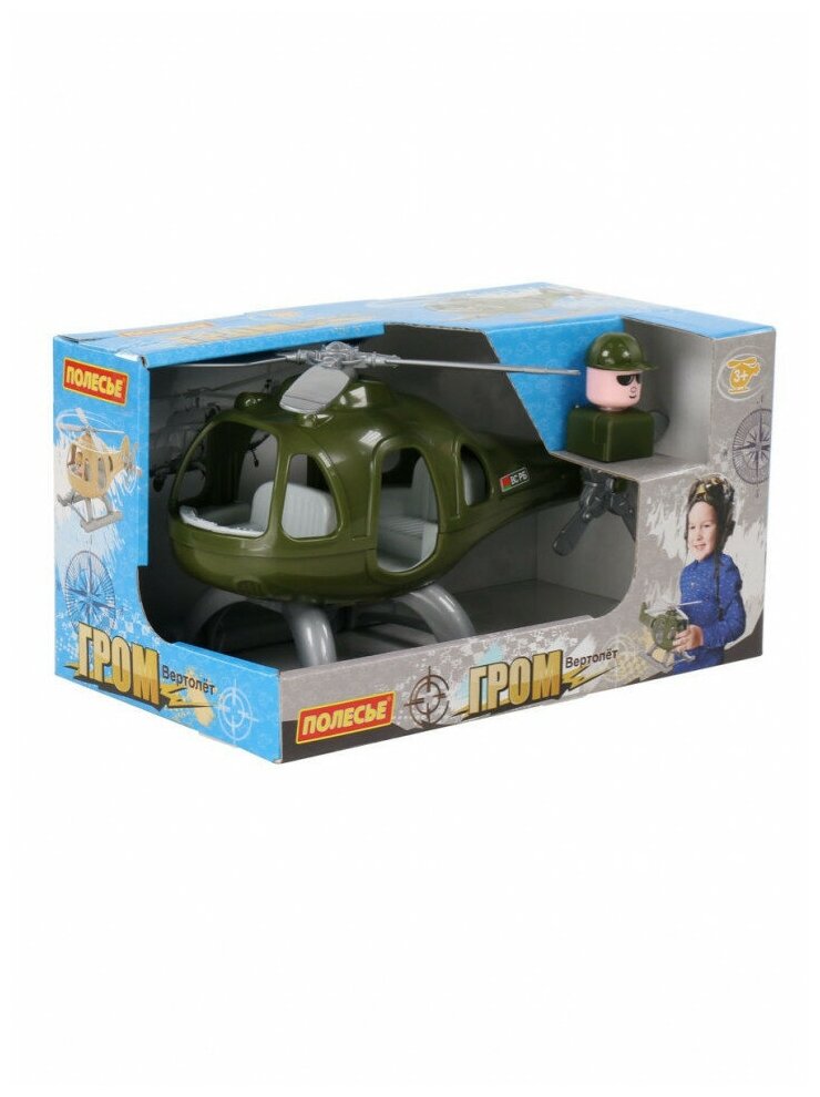 Полесье Вертолёт военный Гром - это игрушка, которая имеет округлую форму и стильный дизайн. Лопасти вертолёта подвижны, это позволяет сделать игру более реалистичной и захватывающей. Кабина имеет окна и оснащена сиденьями, одно из которых занимает фигурка пилота. Также конструкция вертолёта предполагает наличие шасси с колёсиками. Они позволяют передвигать игрушку по плоской поверхности и способствуют созданию различных игровых сценариев.