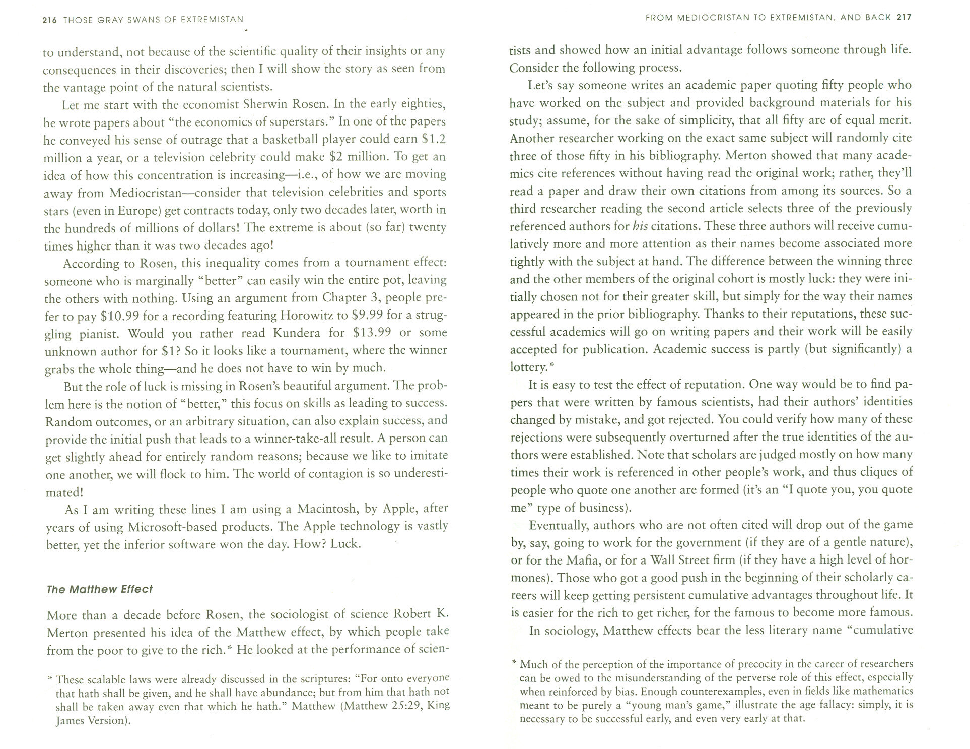 Эта книга поднимает ряд очень важных вопросов, но главным из них, безусловно, является вопрос о том, как сочетание хорошей идеи и невыносимого автора влияет на впечатления от чтения?) Этот автор ужасен. Он пренебрежительный, хронически неуверенный в себе, неструктурированный и враждебный по отношению к своим недоброжелателям. Он использует то, что может быть самой низкой формой риторики, заранее нападая на любых критиков (даже до того, как у них будет возможность выступить), как на слишком глупых или зашоренных, чтобы следовать его аргументам. Он пренебрежительно относится к целым дисциплинам (экономике, праву, социальным наукам), не делая особых попыток заниматься критикующими его концепциями за пределами самого широкого уровня общности. У него огромный козырь на плече по отношению к научному/академическому истеблишменту (когда он делает небрежную, касательную атаку на Нобеля). Хуже всего то, что он бесконечно отступает и излагает свои отступления языком капризного гения, а не просто плохим письмом.