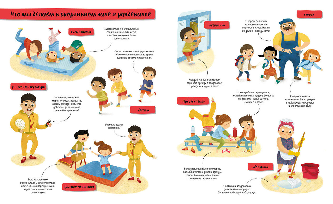 Сюжеты больше подходят для иностранных школьников, чем для наших, но всё равно можно познакомить ребенка с правилами школы. На страничках только рисунки и небольшие поясняющие надписи.