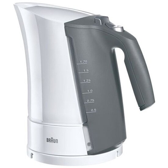Braun - легкий оригинальный чайник с функциональным дизайном. Тепловая мощность нагревающей спирали составляет 3000 Ватт. Этого хватит для закипания воды за полминуты. Достаточно залить воду желательно очищенную после фильтра и нажать на кнопку пуск. После достижения температуры воды в 100 градусов специальное тепловое реле быстро отключит чайник от сети. Это удобно и экономит время. Теперь уже не нужно находиться близко и выключать его по мере закипания.