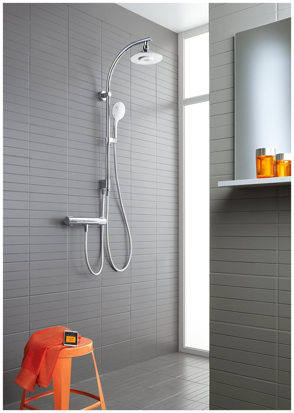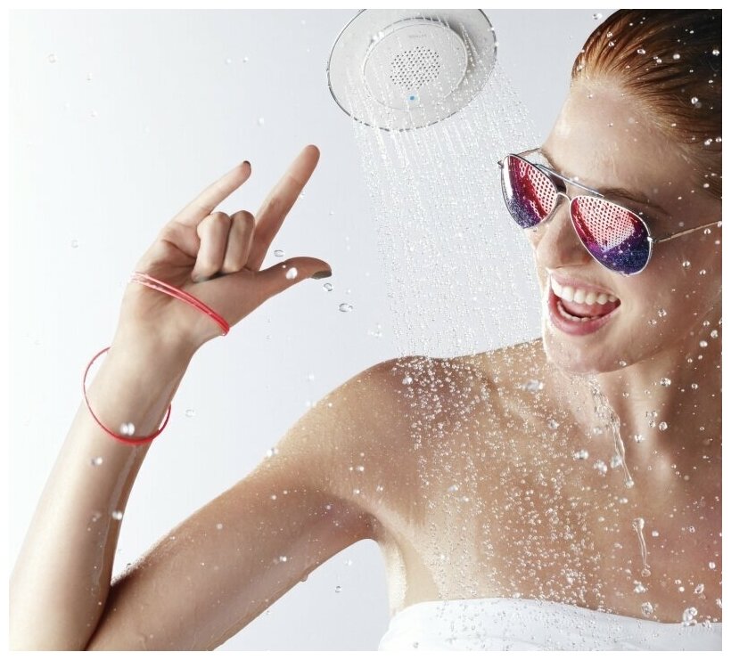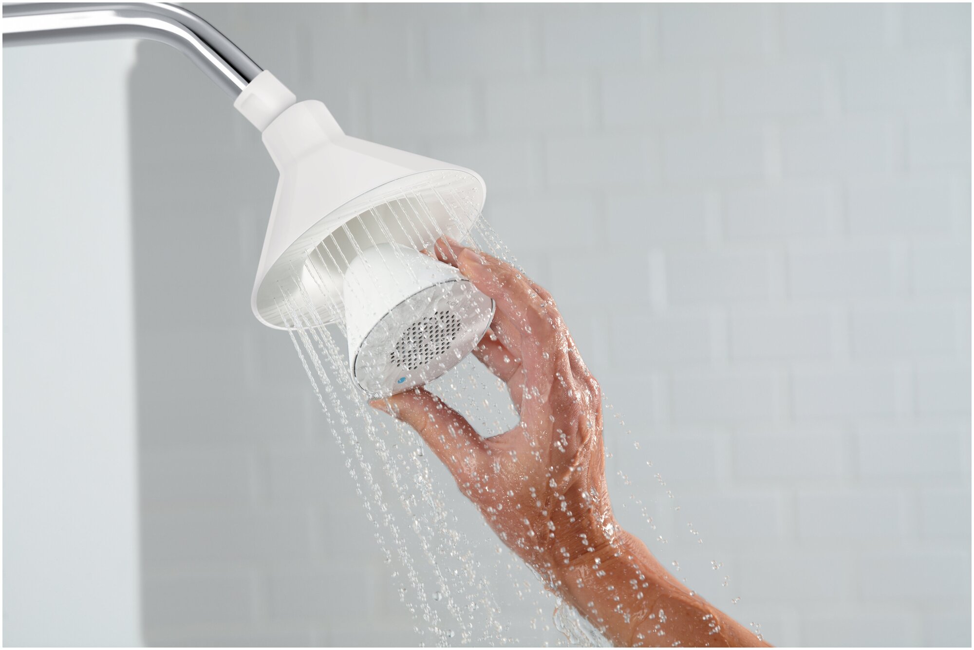 Душевой гарнитур Moxie. Круглый верхний душ диаметром 200 мм. 80 выпускных отверстий с антиизвестковым покрытием. Расход воды верхнего душа: 10 л/мин. Технология Katalyst (подача воздуха 2 л/мин). Магнитный динамик для прослушивания музыки во время принятия душа и вне душевой кабины. Синхронизируется с устройствами, оснащенными технологией Bluetooth. Гибкий нескручивающийся шланг. Ручной душ, диаметр 120 мм. Выпускное отверстие с антиизвестковым покрытием 1600 мм. Смеситель не идет в комплекте